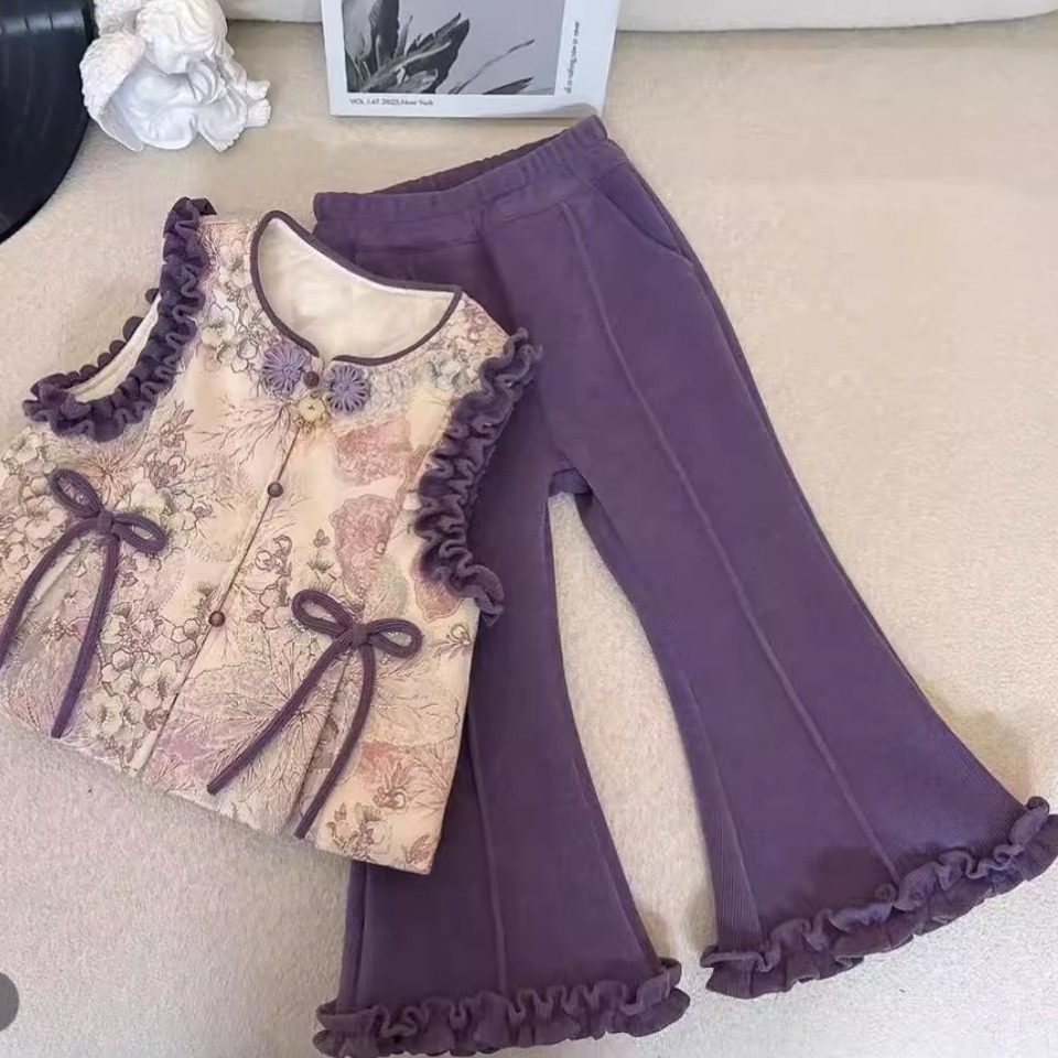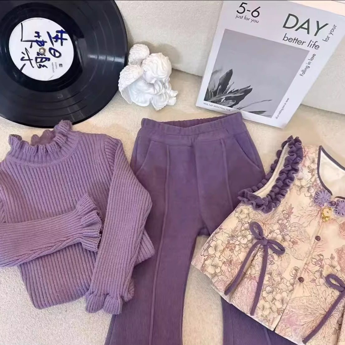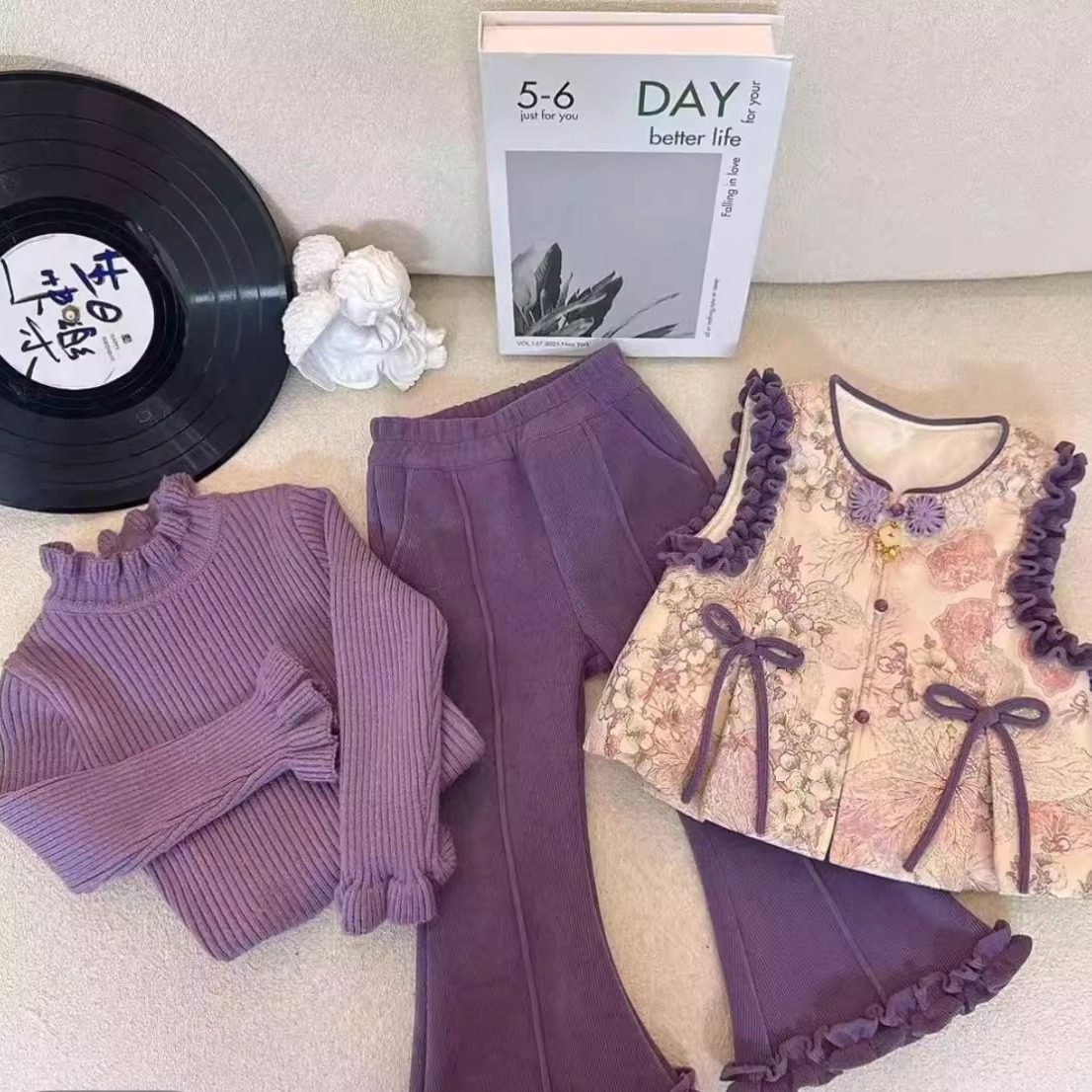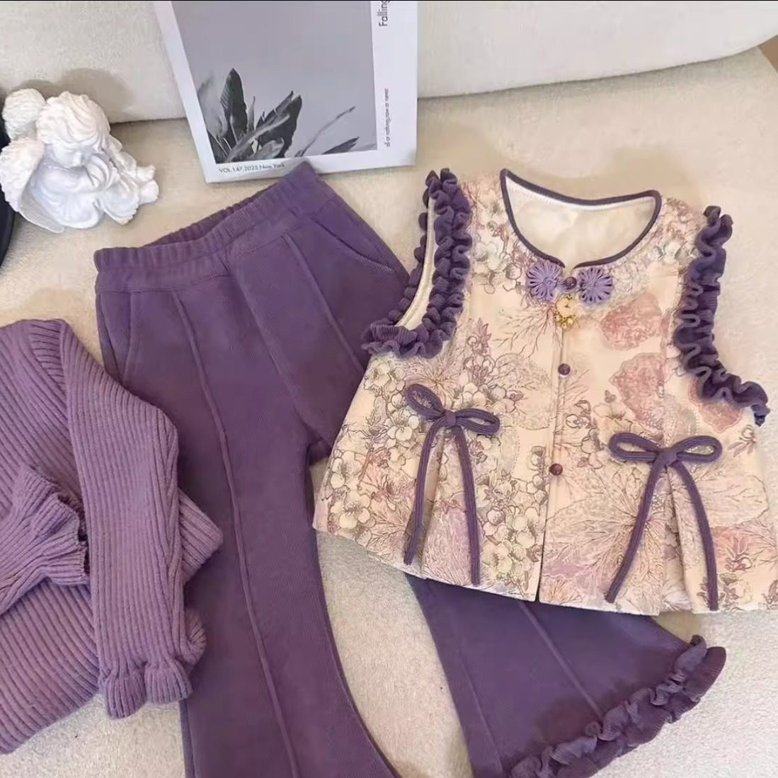 女童冬季套装2025新款国风加棉保暖马甲加绒裤子保暖加毛衣三件套