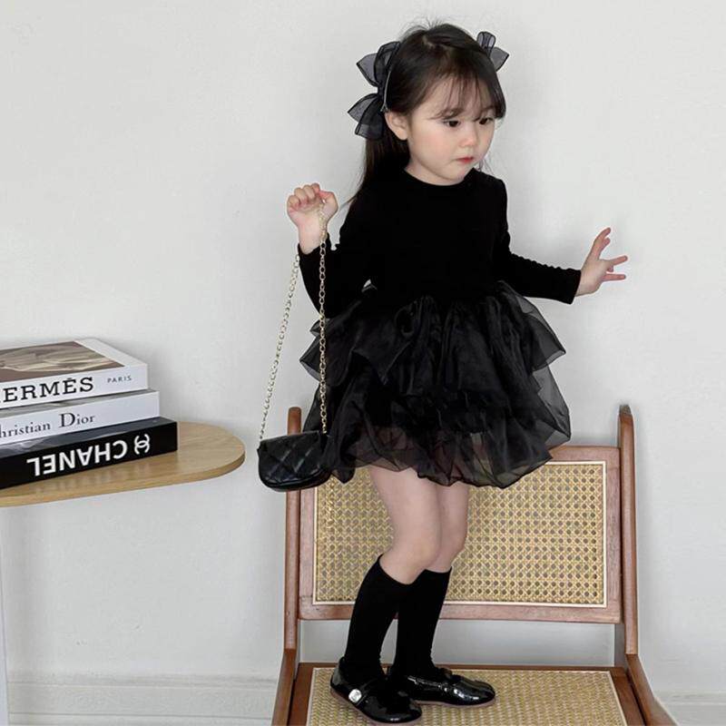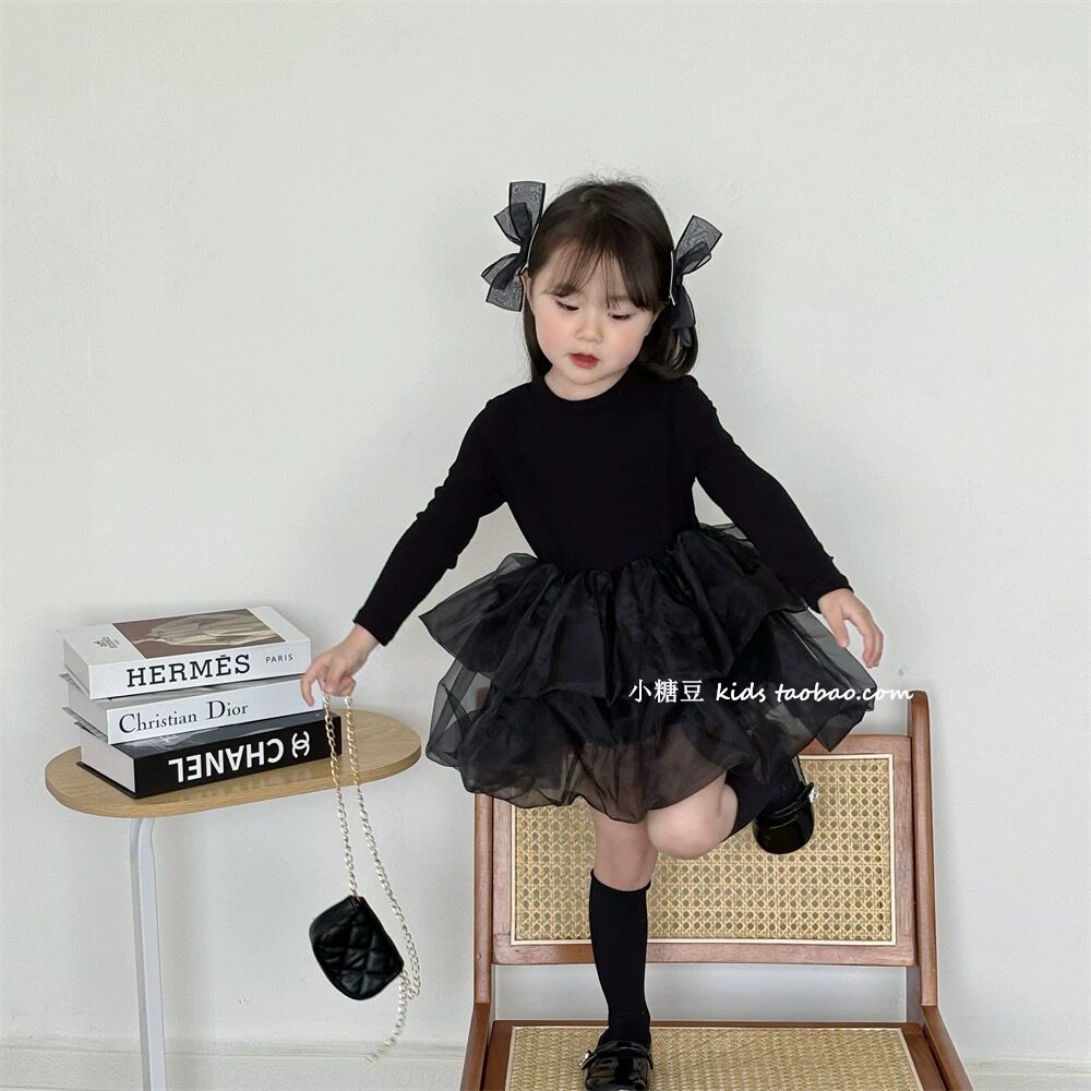 秋冬款女童长袖小黑裙蓬蓬纱公主裙加绒加厚女孩芭蕾裙连衣裙洋气