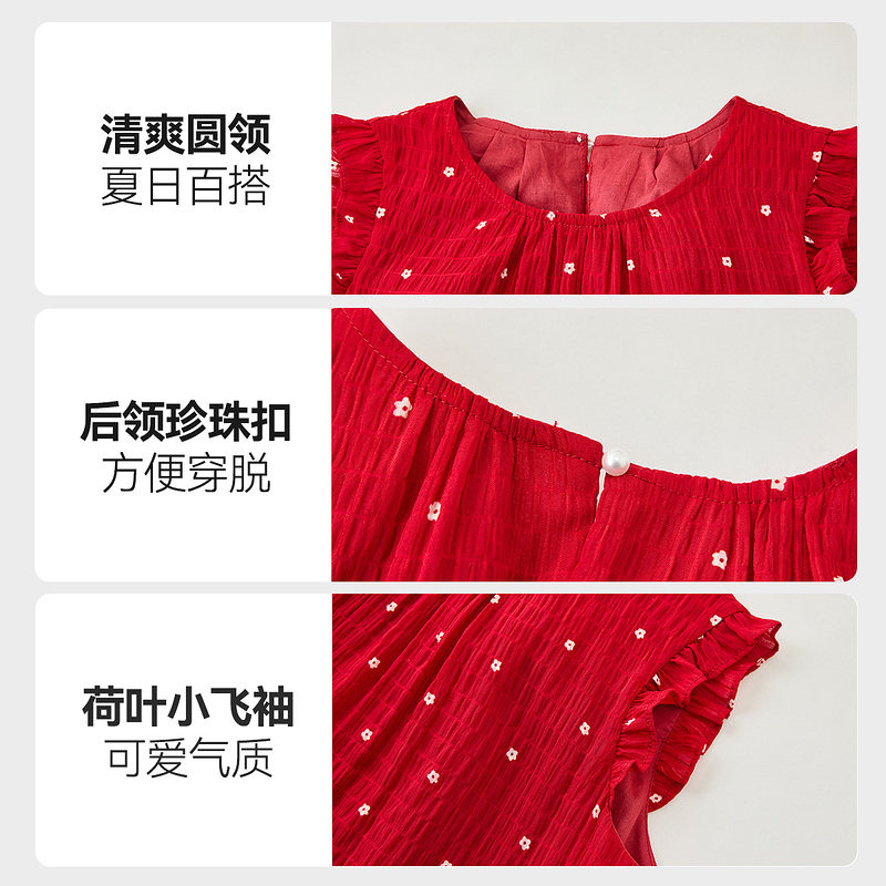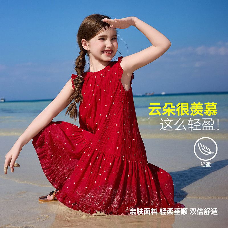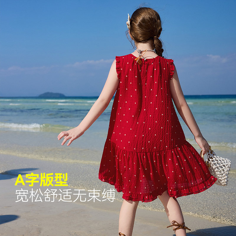 ask儿童裙子2026夏季新款女童红色波点长裙中大童无袖连衣裙