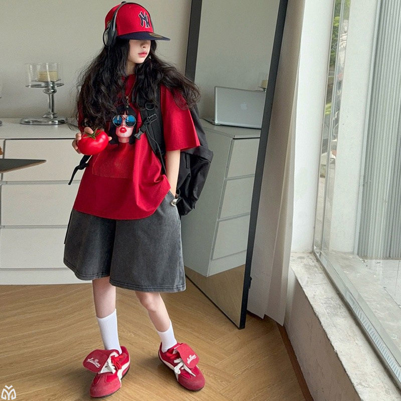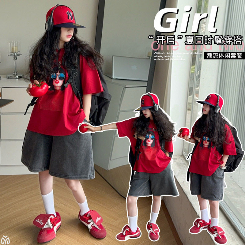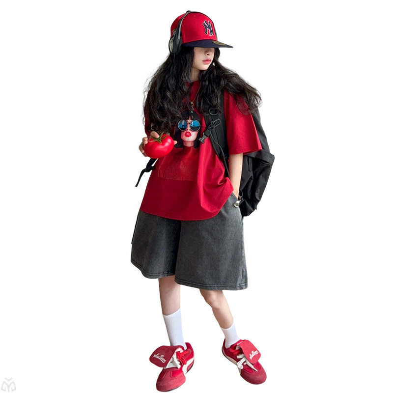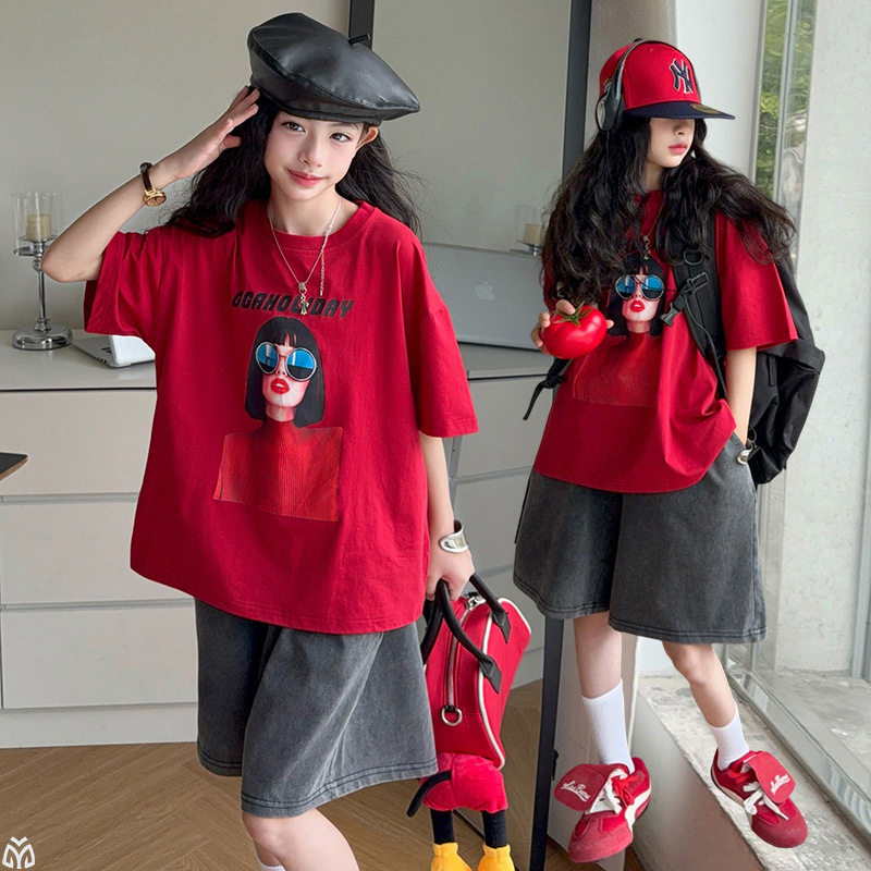 女童红色T恤短袖衫女大童夏薄款牛仔马裤女孩宽松上衣五分短裤子