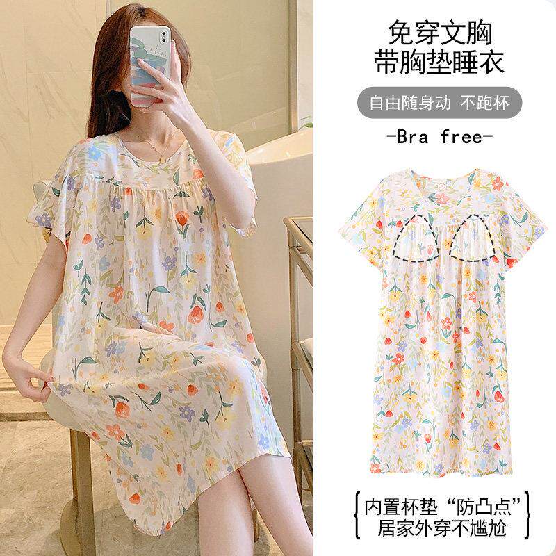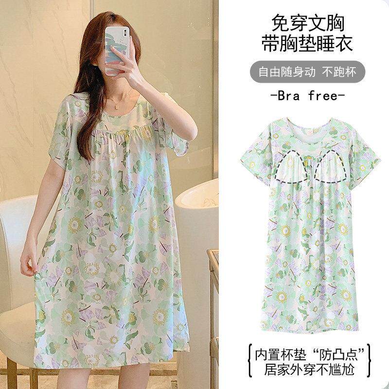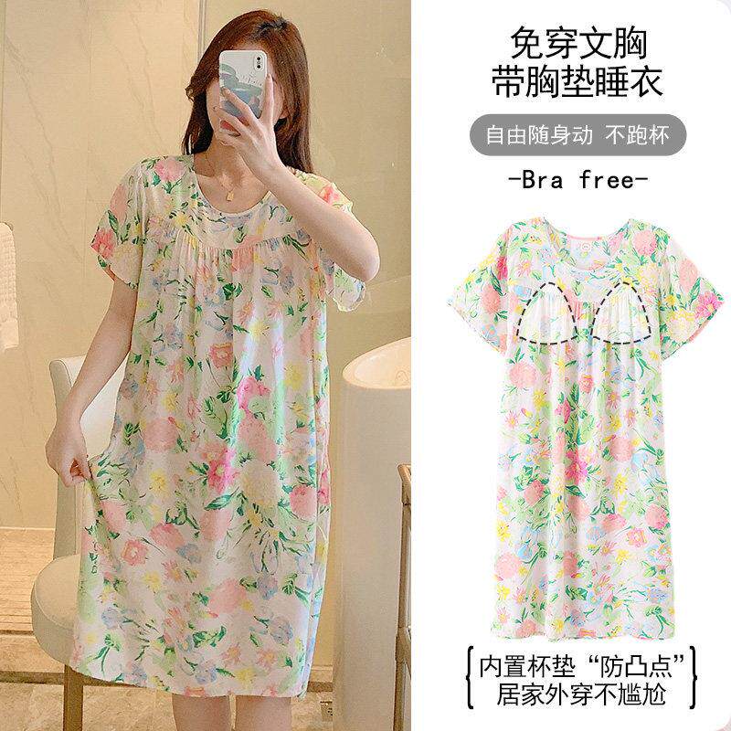 大尺码棉绸睡裙带胸垫一体式可外穿女士人造棉连身睡裙夏季宽松款
