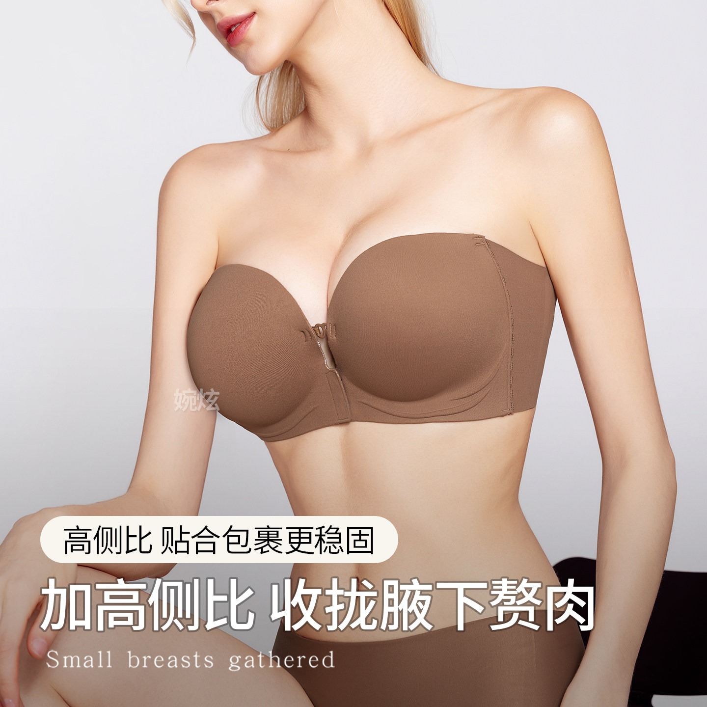 加厚5cm无肩带内衣女防滑聚拢小胸显大不空杯抹胸无痕前扣文胸罩
