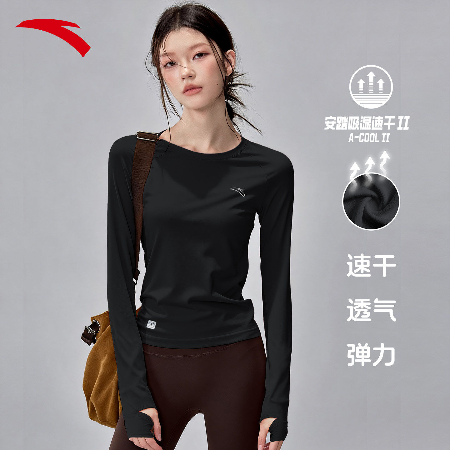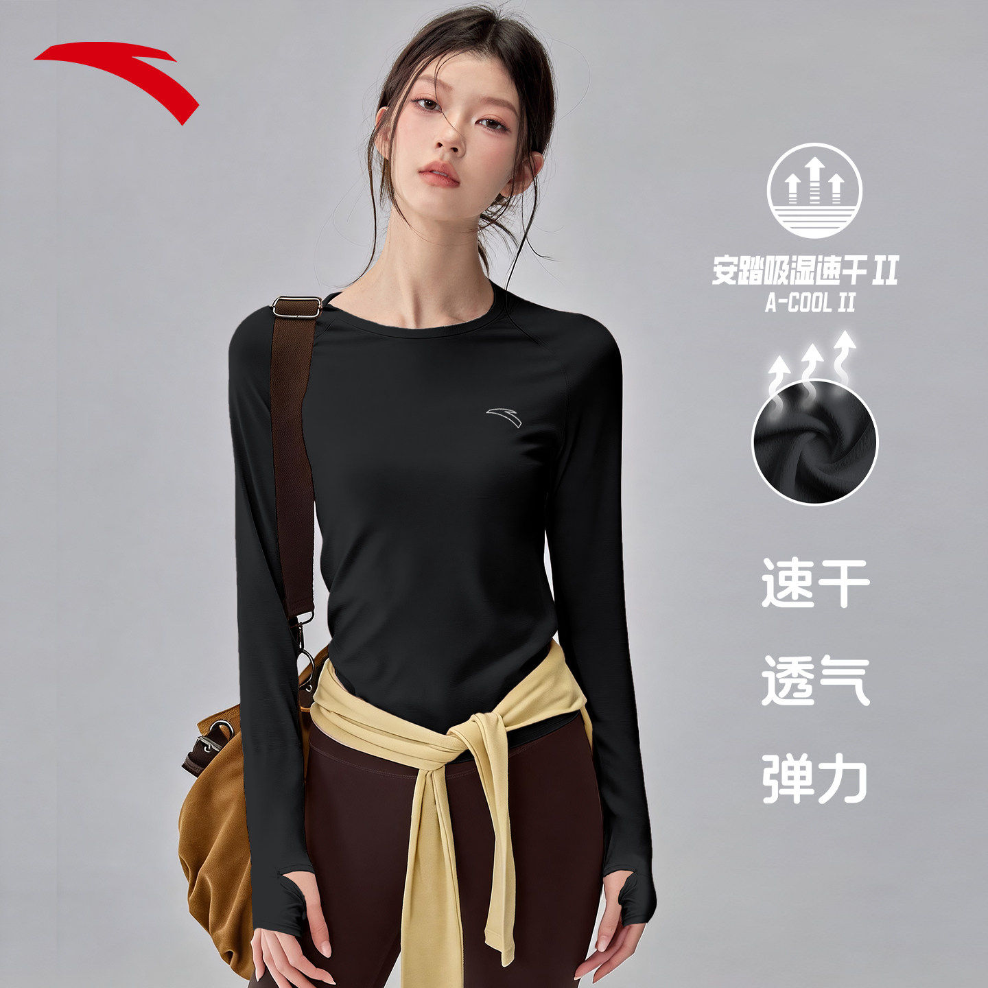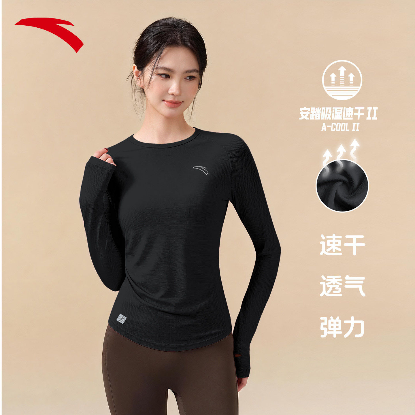 安踏跑步运动t恤长袖女款2026新款修身透气速干训练瑜伽健身上衣