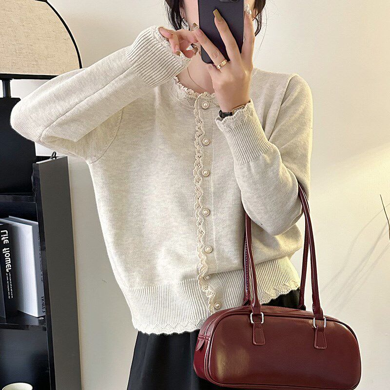 蕾丝红色开衫毛衣外套女款2024新款秋冬针织高级感小个子加厚女士
