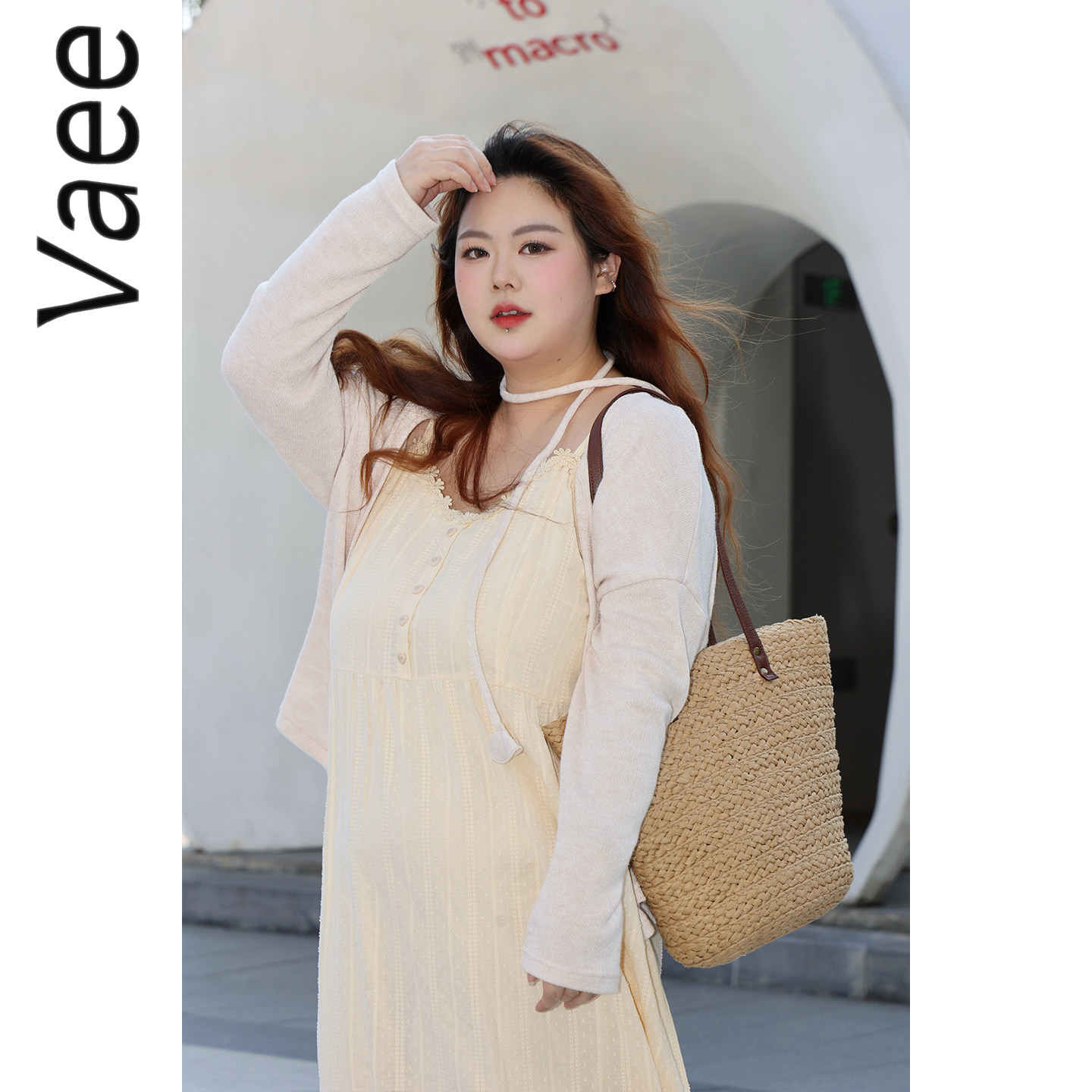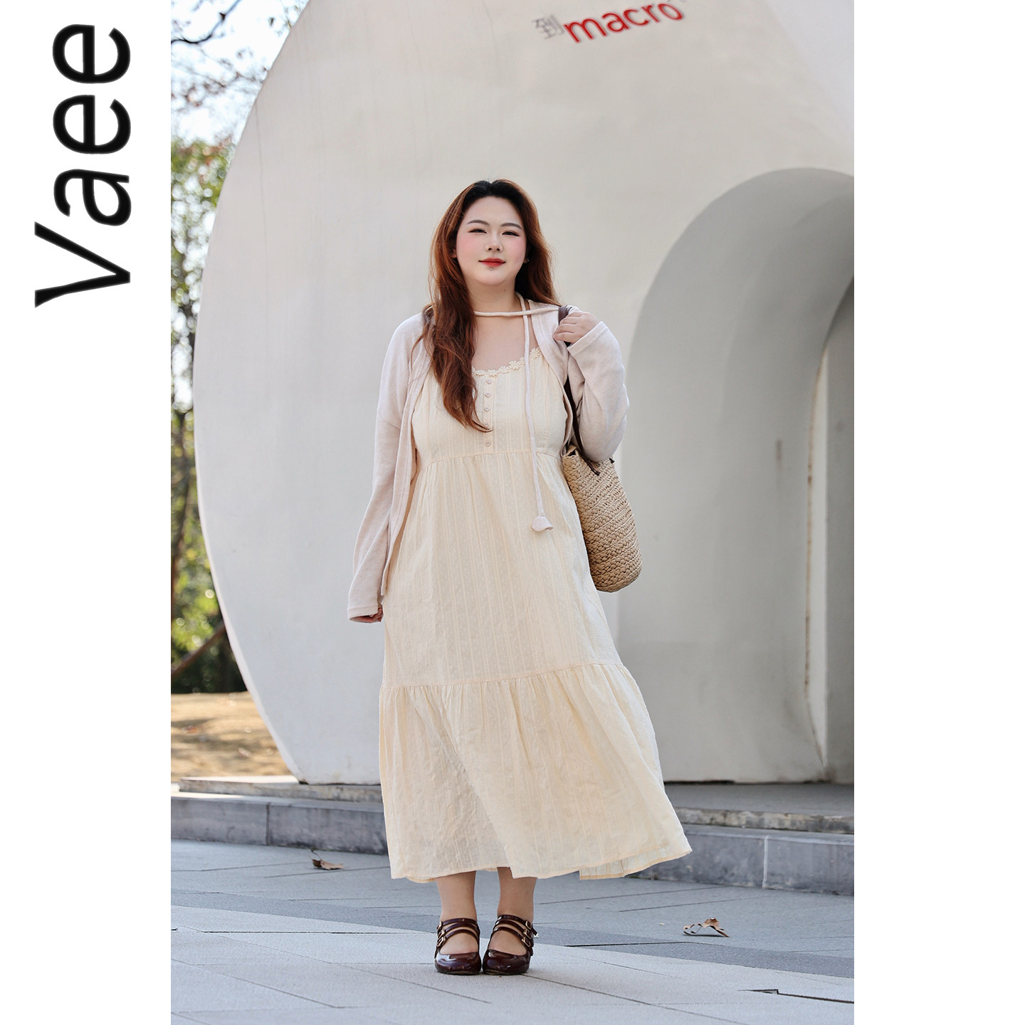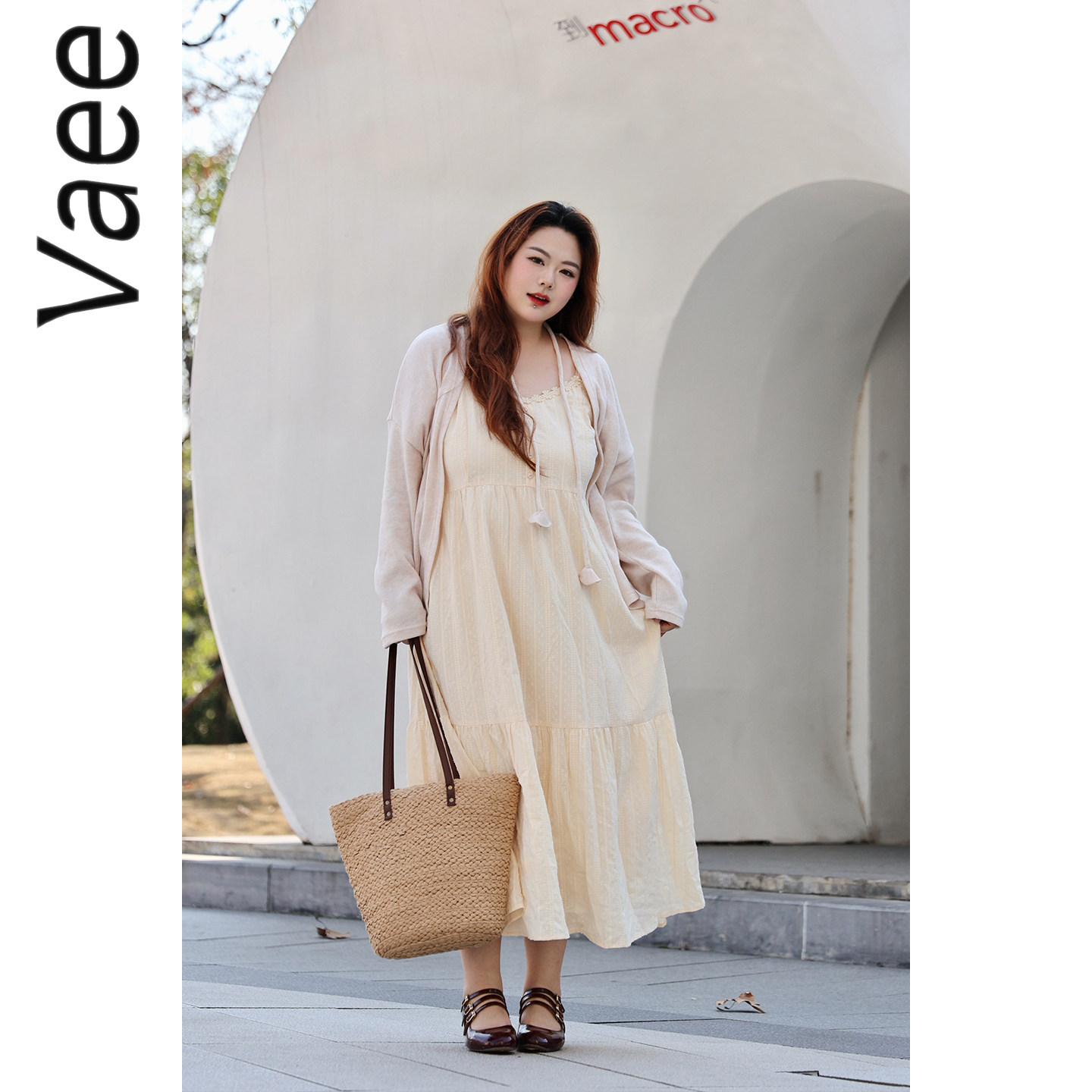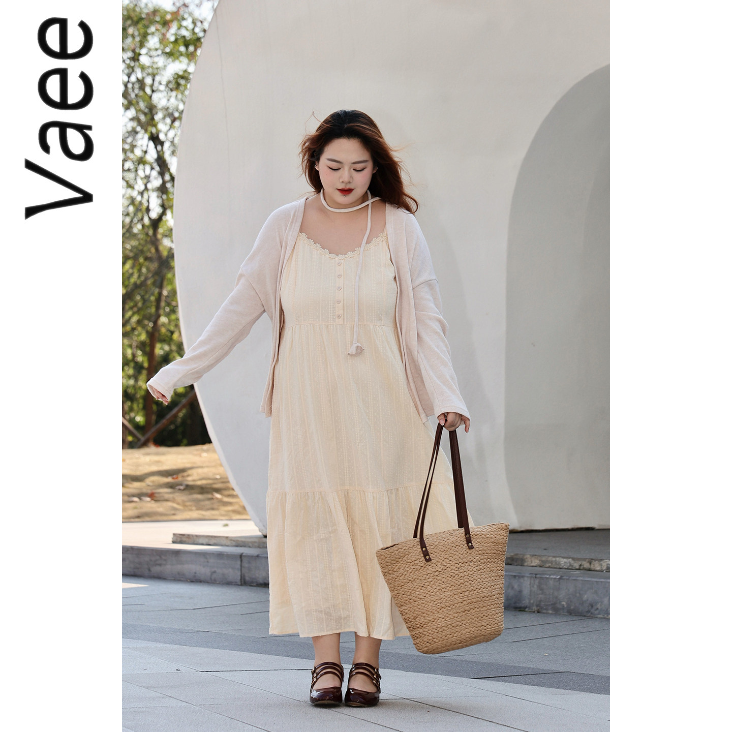 Vaee大码女装两件套短款防晒长袖开衫上衣法式温柔风吊带连衣裙
