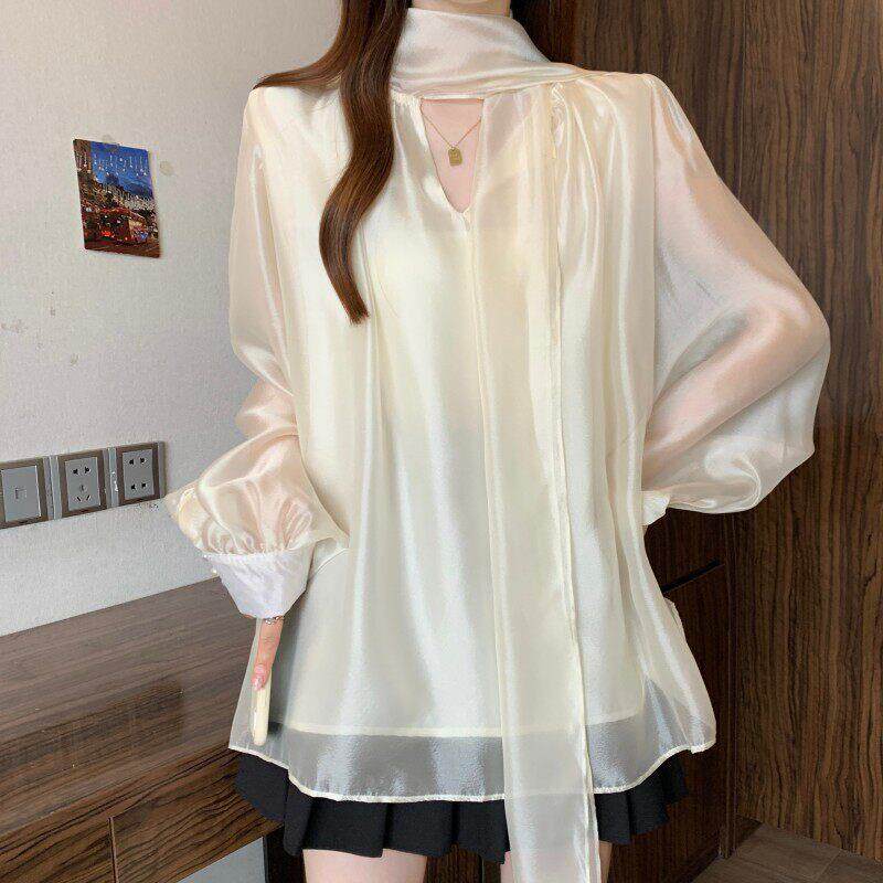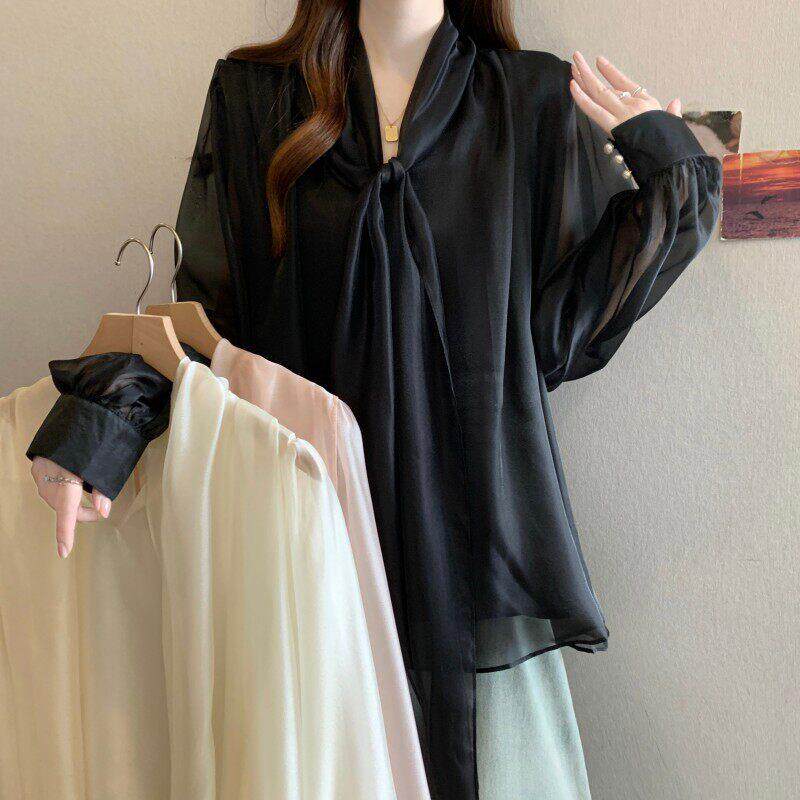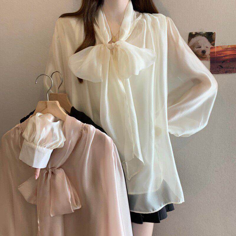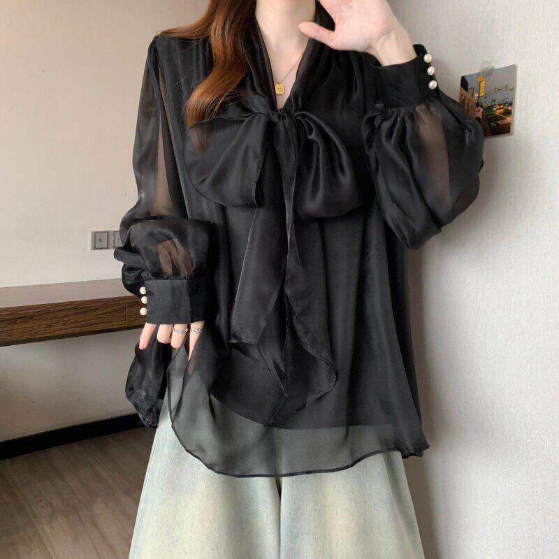 系带蝴蝶结长袖雪纺衬衫女款2026春季大码胖mm高级感法式轻奢上衣