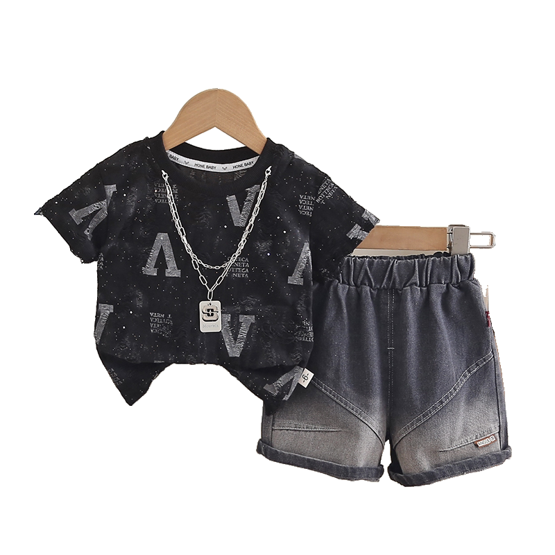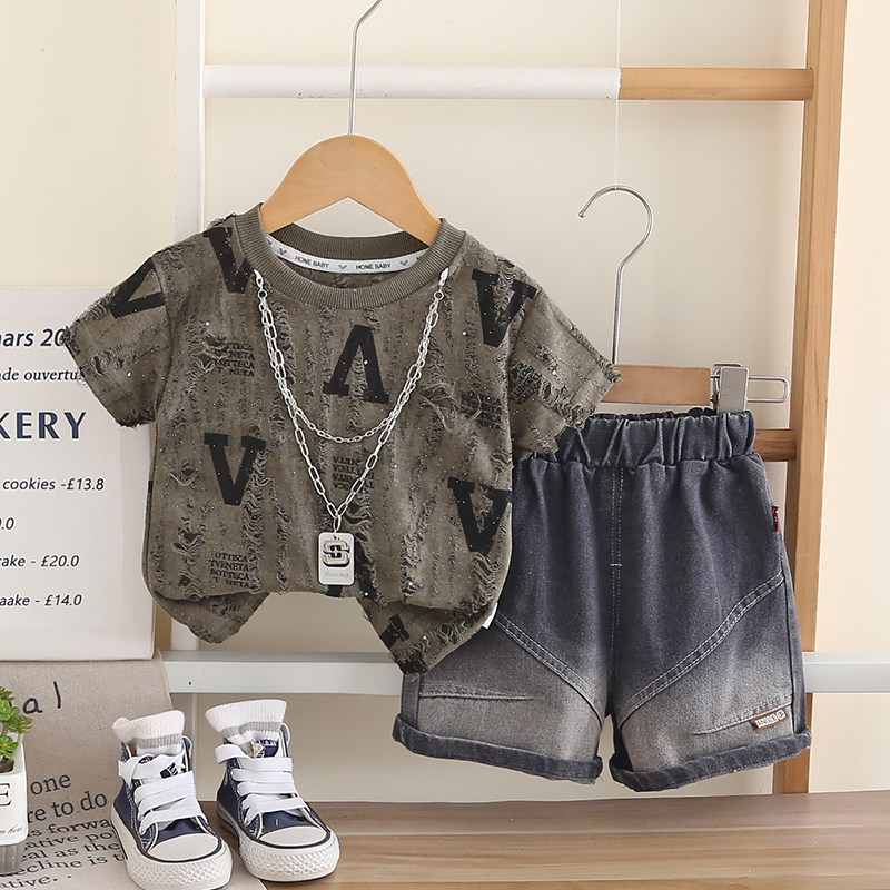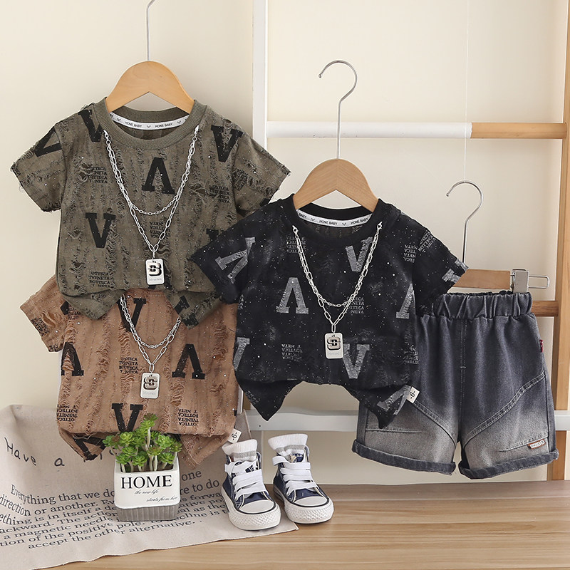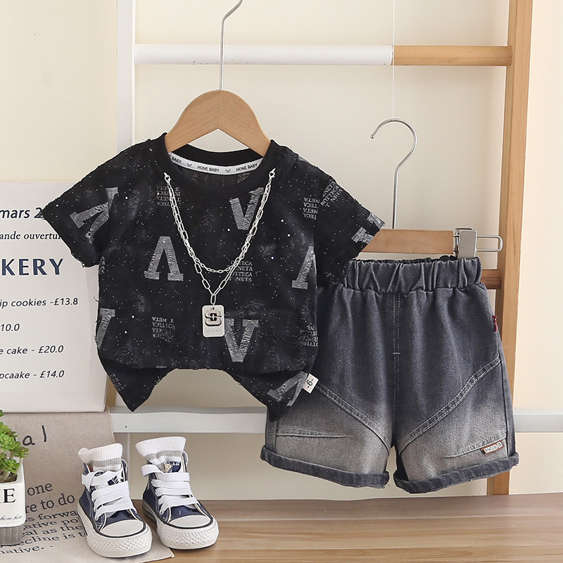 男童夏季短袖套装新款痞帅休闲风字母印花T恤牛仔短裤洋气两件套5