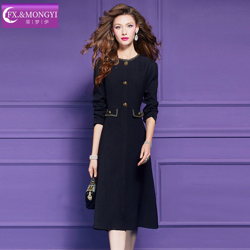菲梦伊小香风黑色连衣裙女长袖春装新款法式修身名媛气质A字裙子