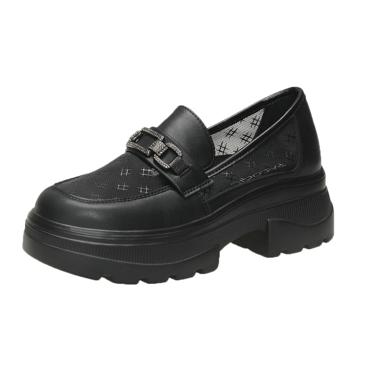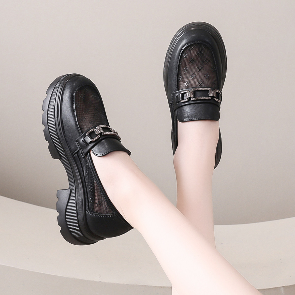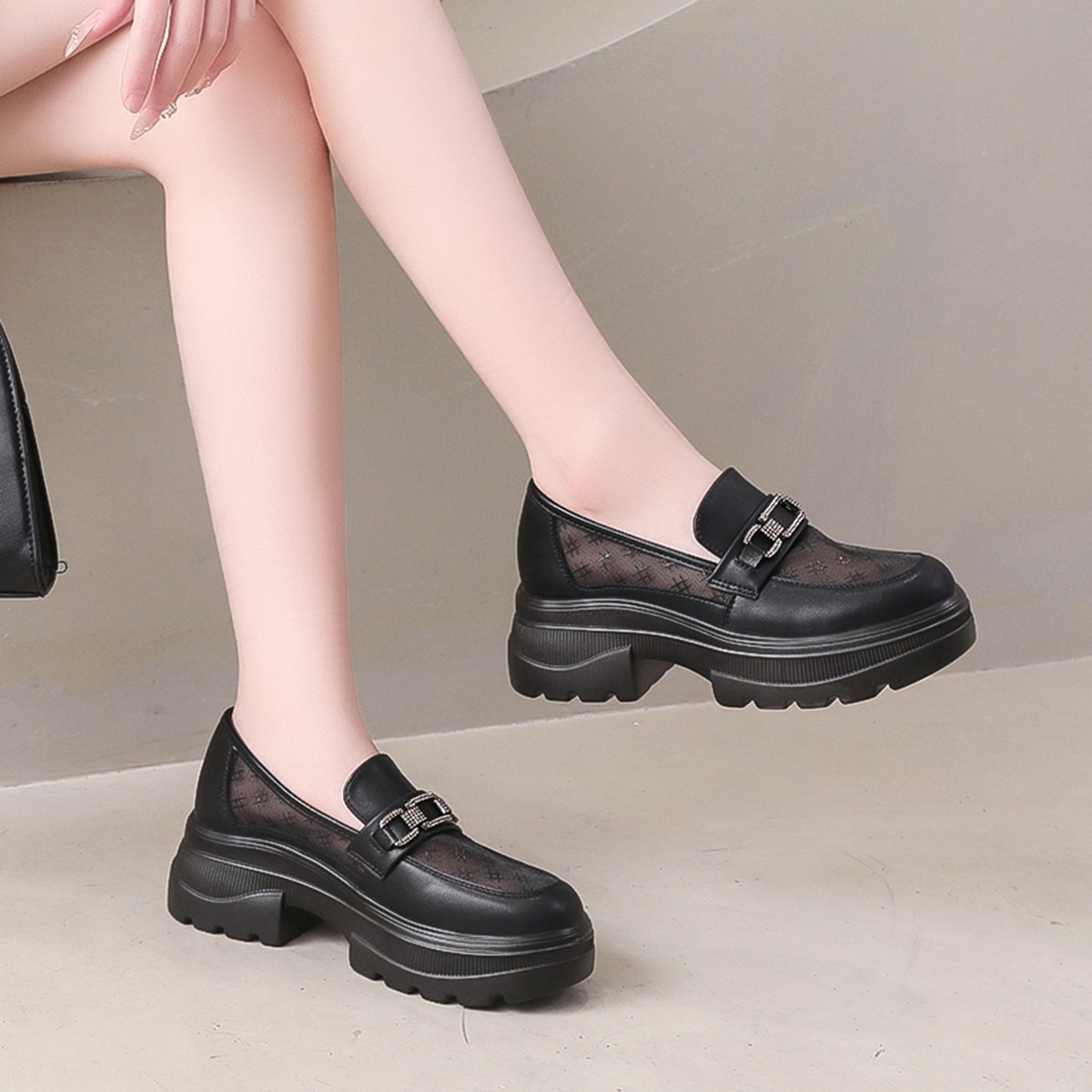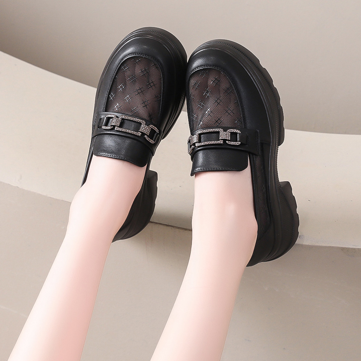 增高透气单鞋女一脚蹬网纱乐福鞋英伦网面厚底小皮鞋夏季薄款女鞋