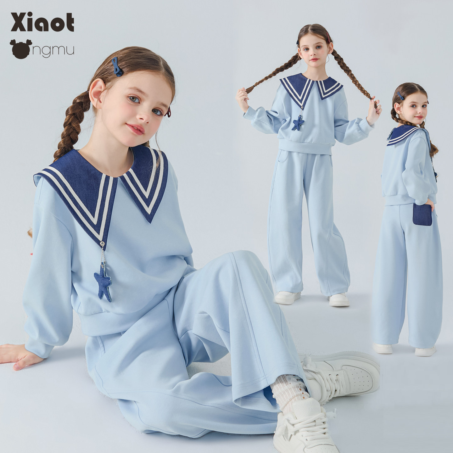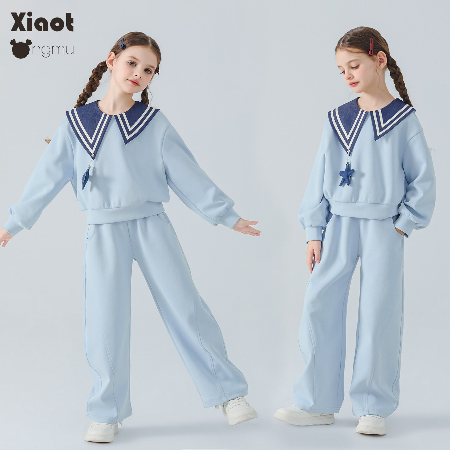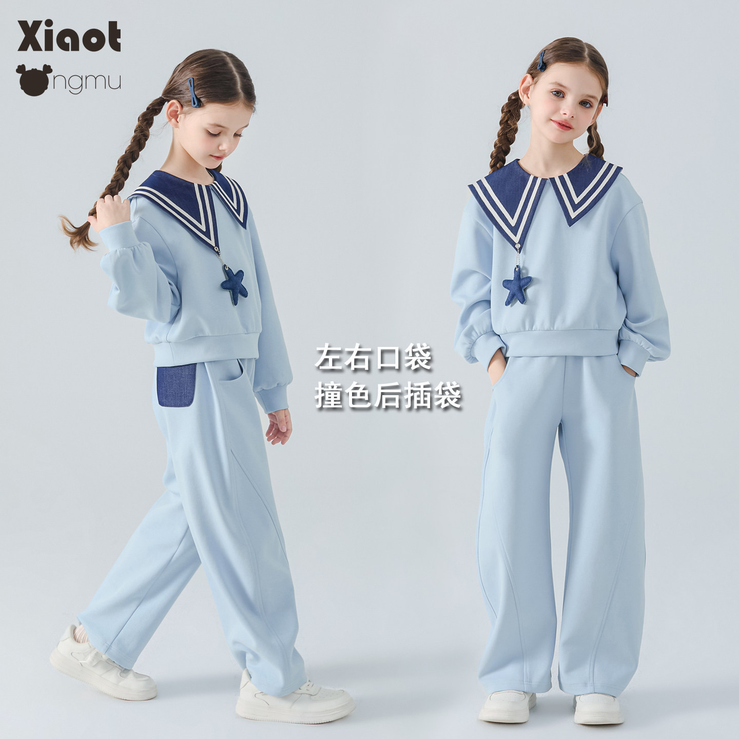 小童木 海军风女童运动套装春季新款中大童套头上衣弯刀裤两件套