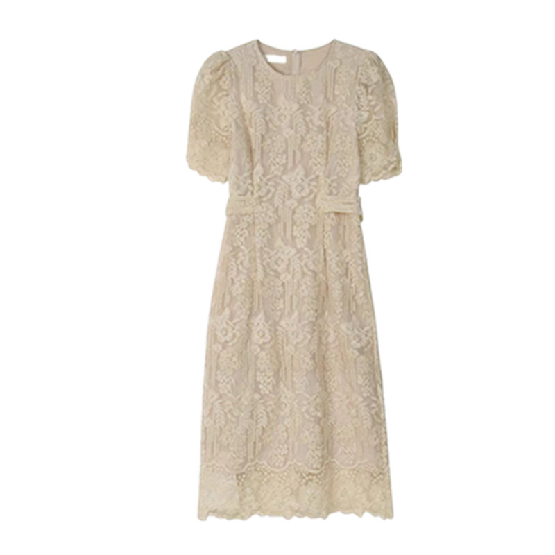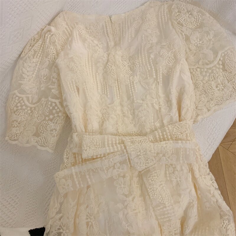 大码胖mm法式高级感系带收腰白色蕾丝连衣裙女夏显瘦中长款仙女裙