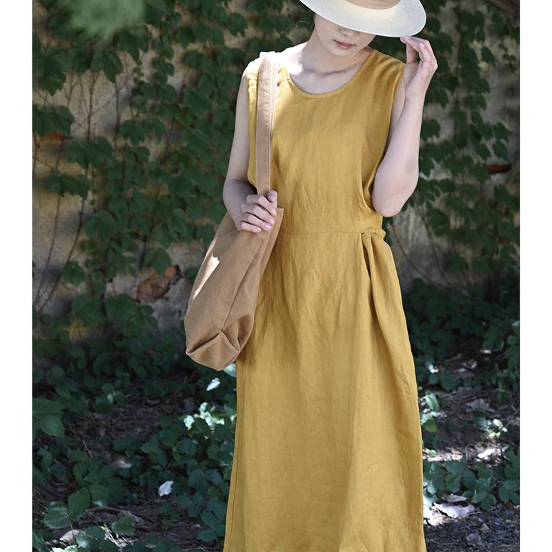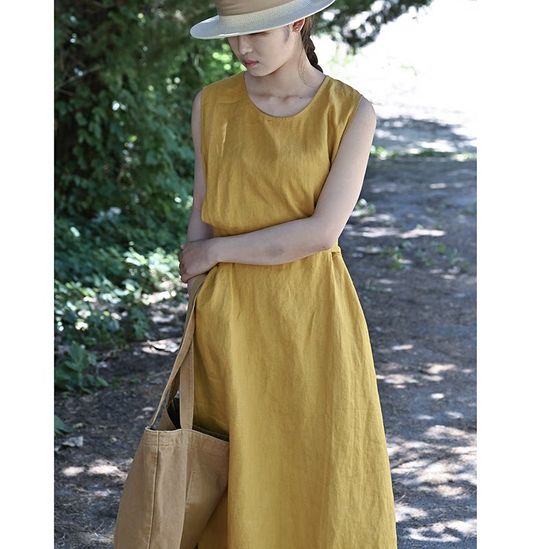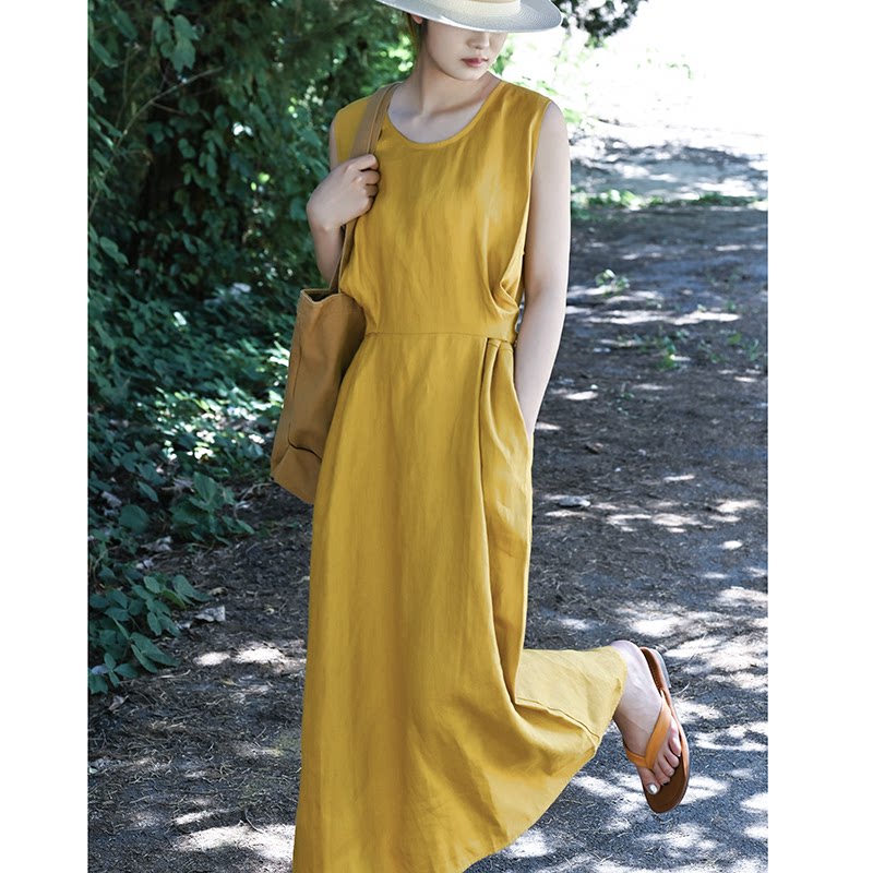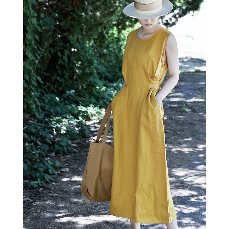 有间2025夏新款亚麻文艺无袖收腰长裙解构式扭结连衣裙女显瘦纯色