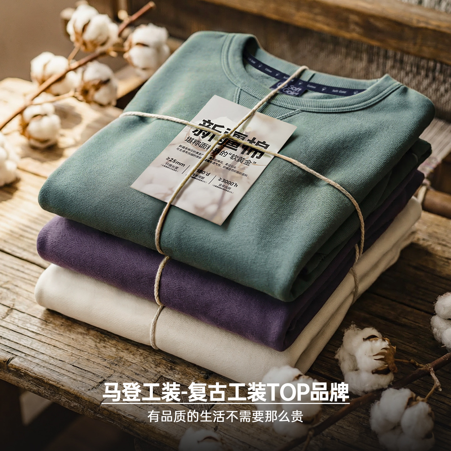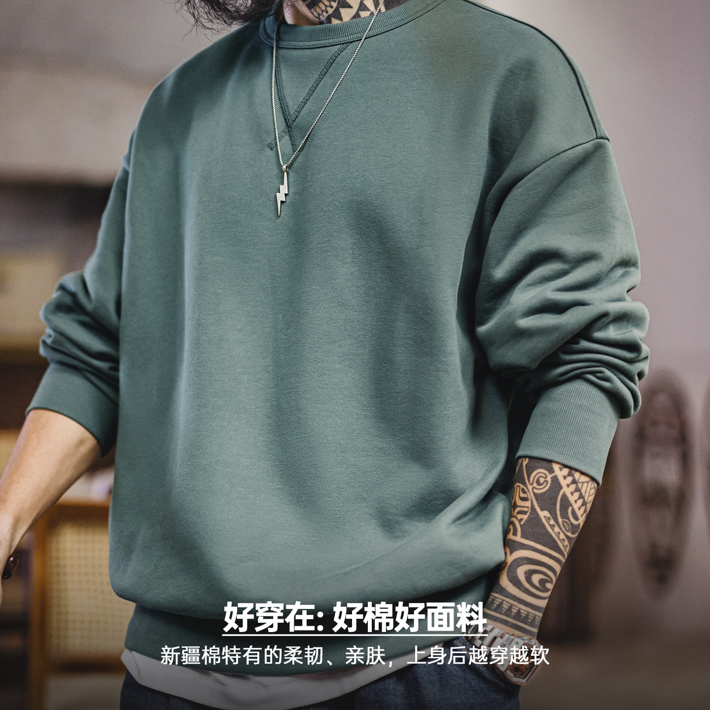 马登工装美式新疆棉卫衣紫色圆领套头无帽外穿宽松长袖外套男款春