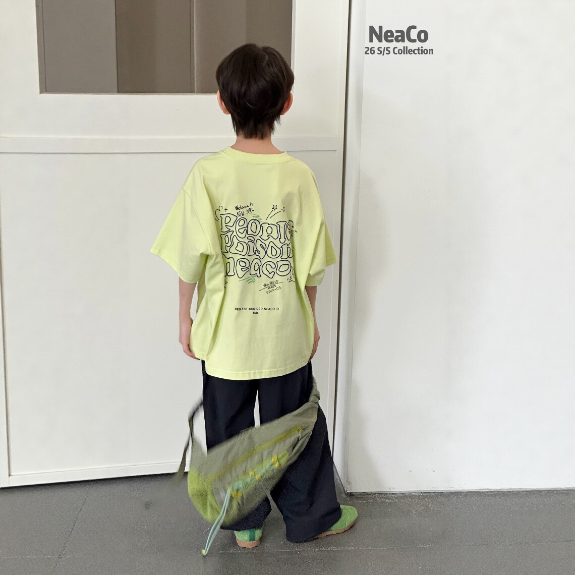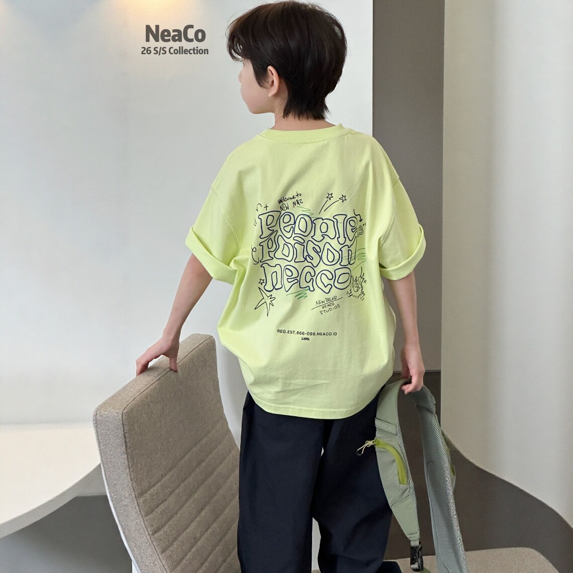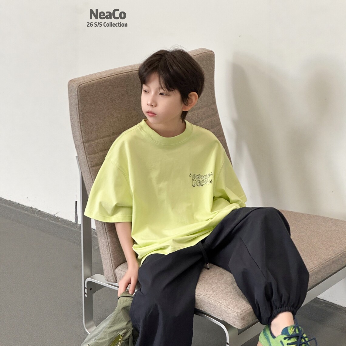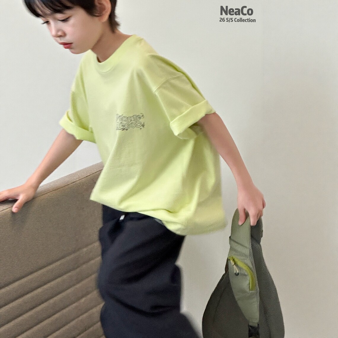 Neaco纽扣2026夏季新款儿童短袖T恤男女童纯棉透气荧光绿半袖上衣