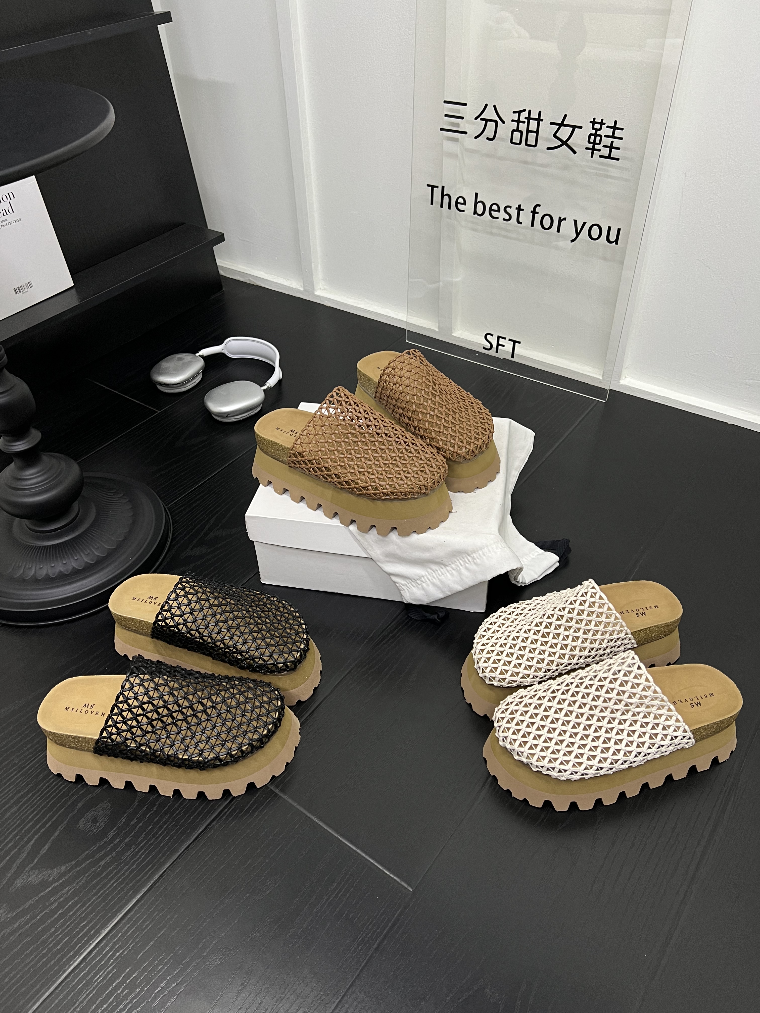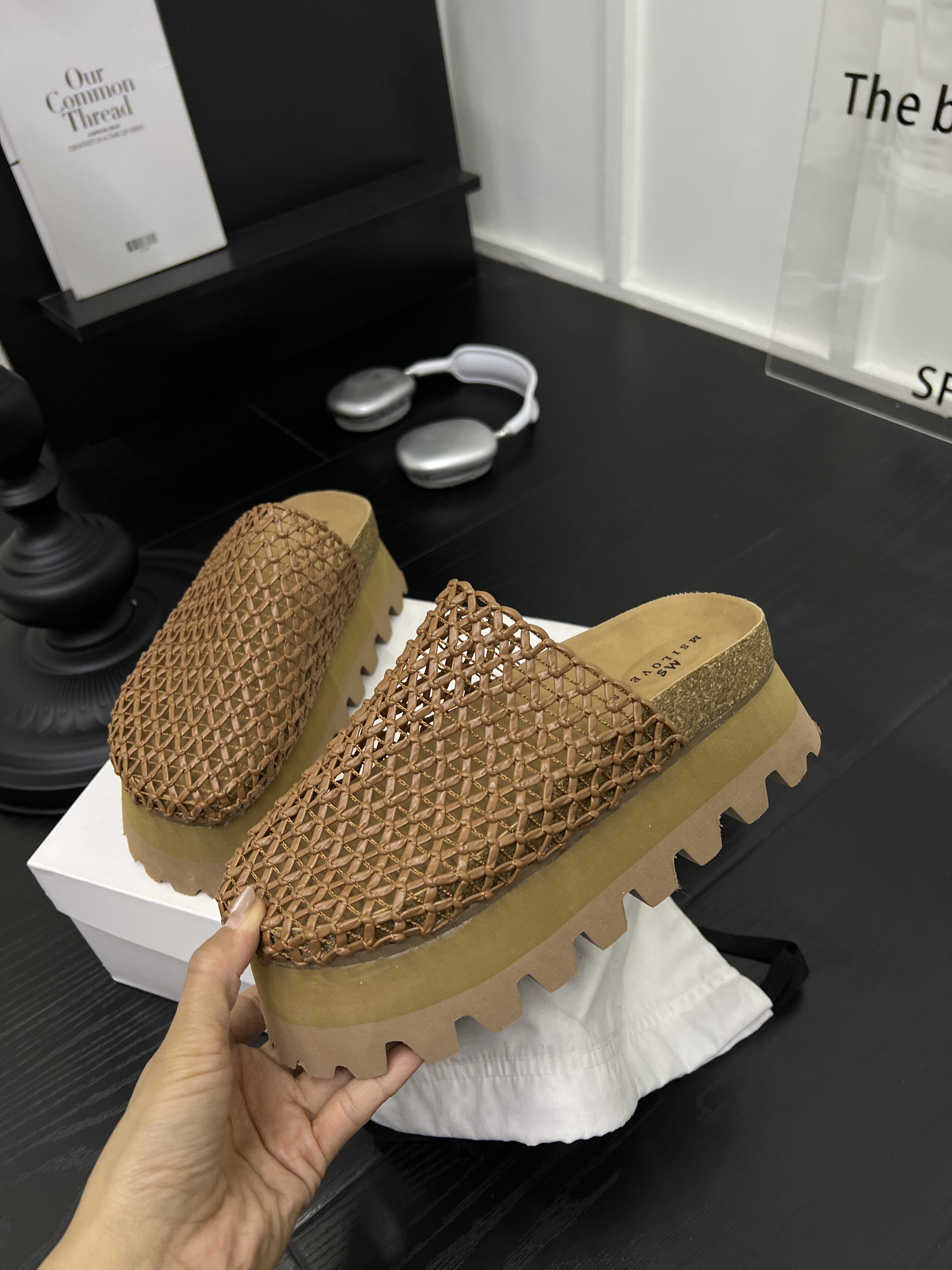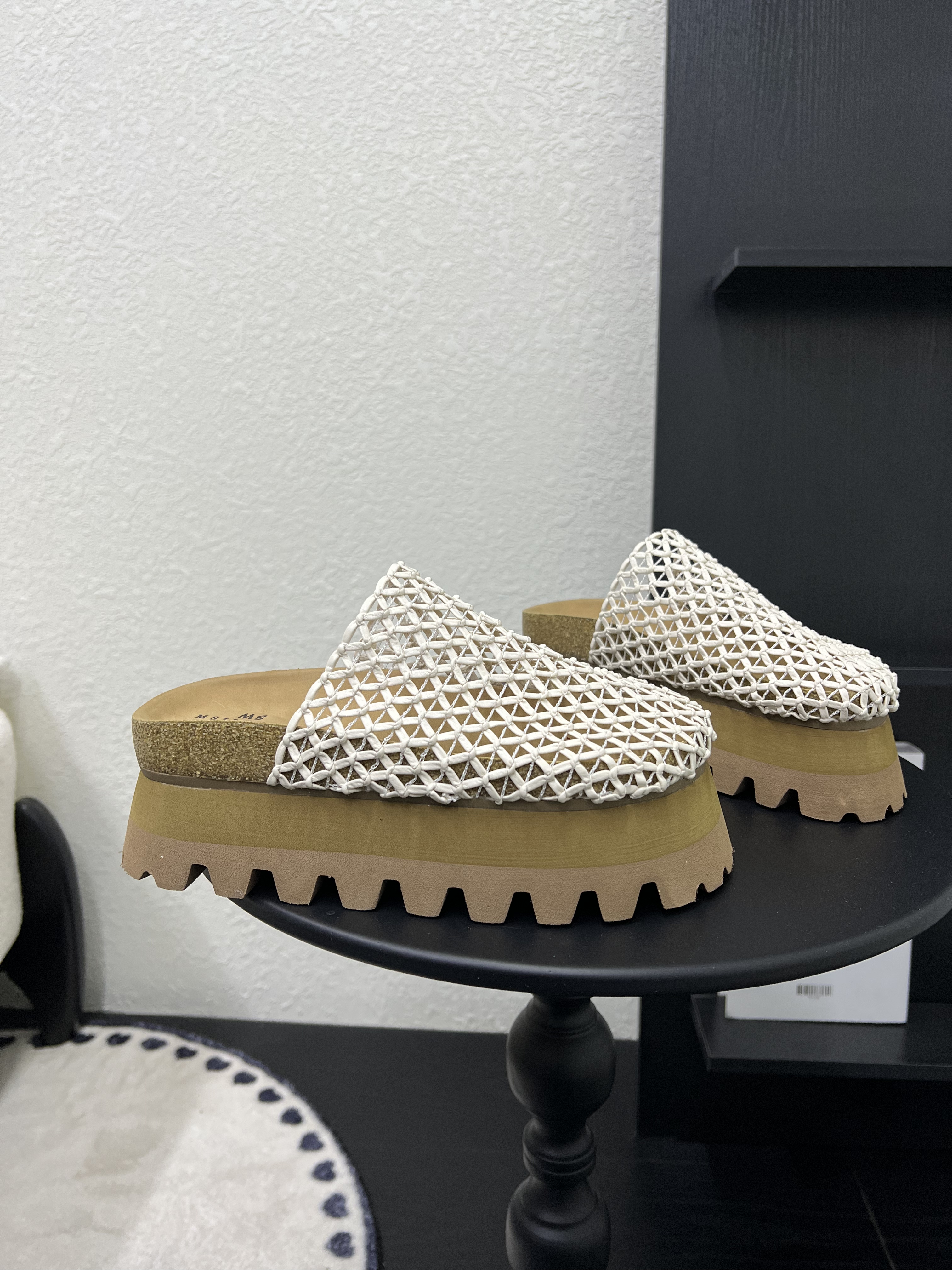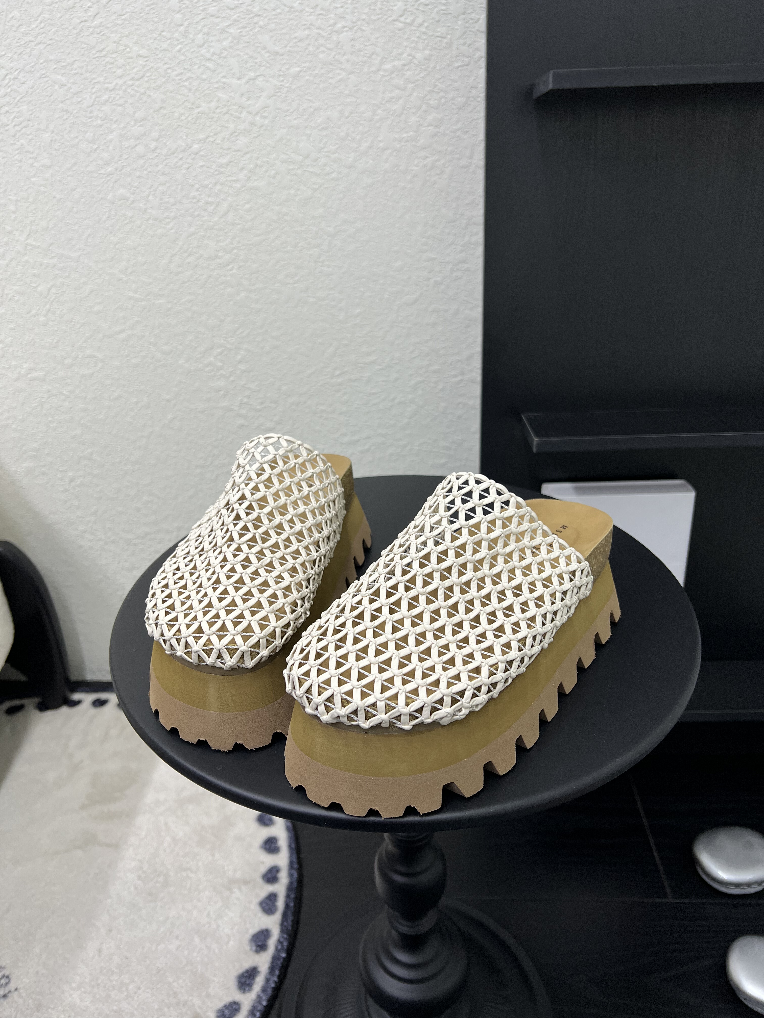 高级感真皮编织镂空松糕厚底包头拖鞋女2026夏新款渔网半拖鞋外穿