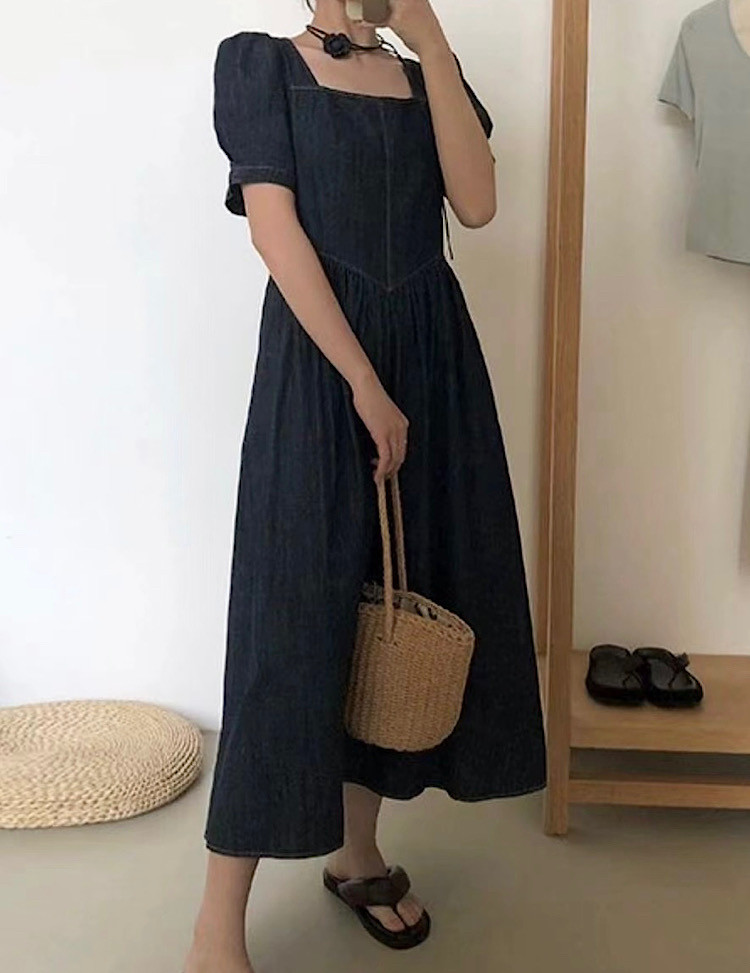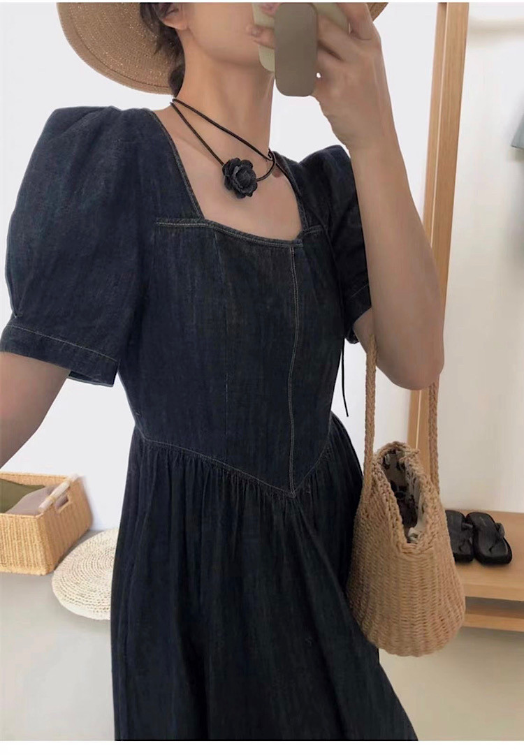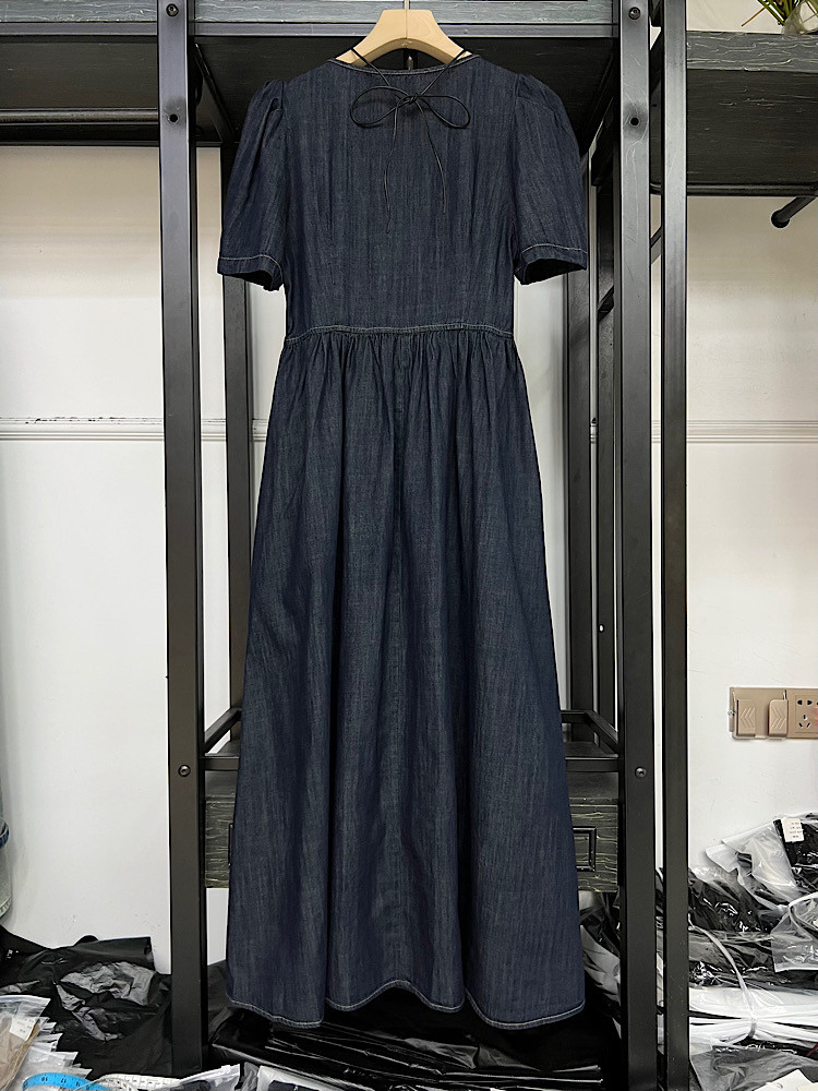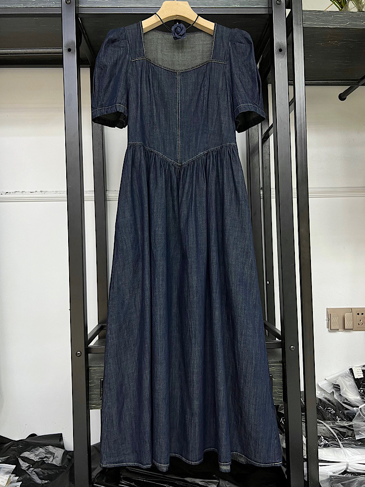 高级薄款纯棉牛仔连衣裙5259配挂件垂感百褶修身小个子女2025夏季