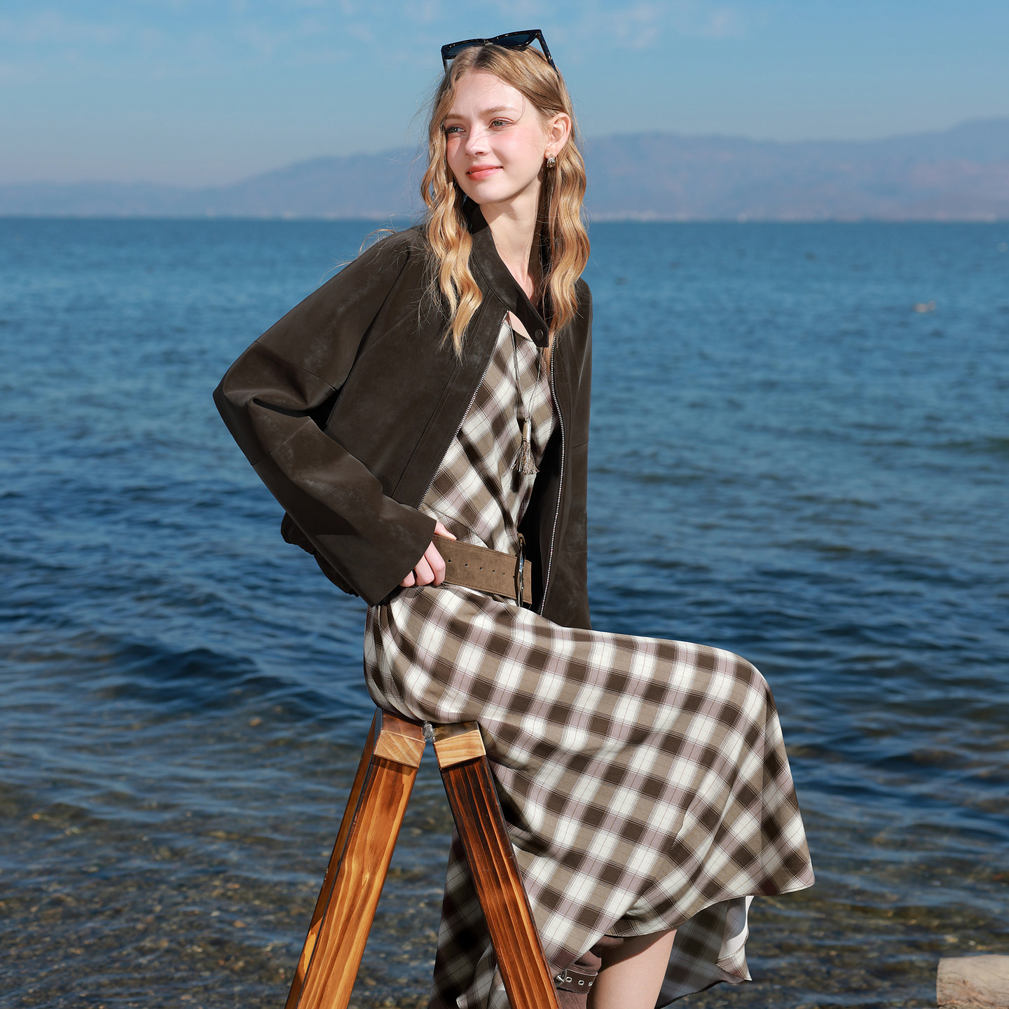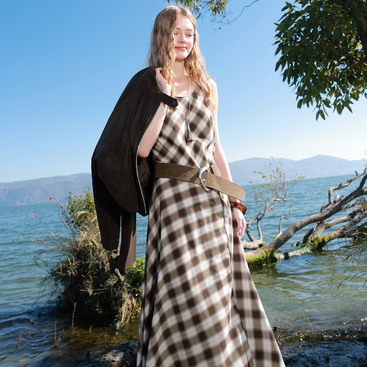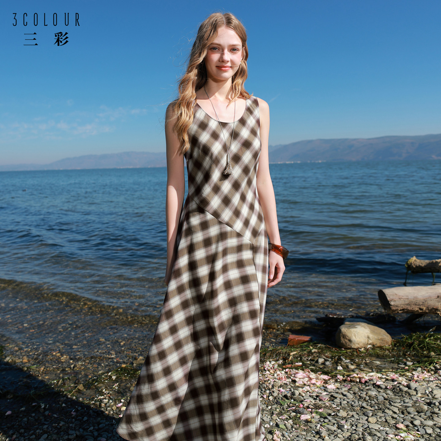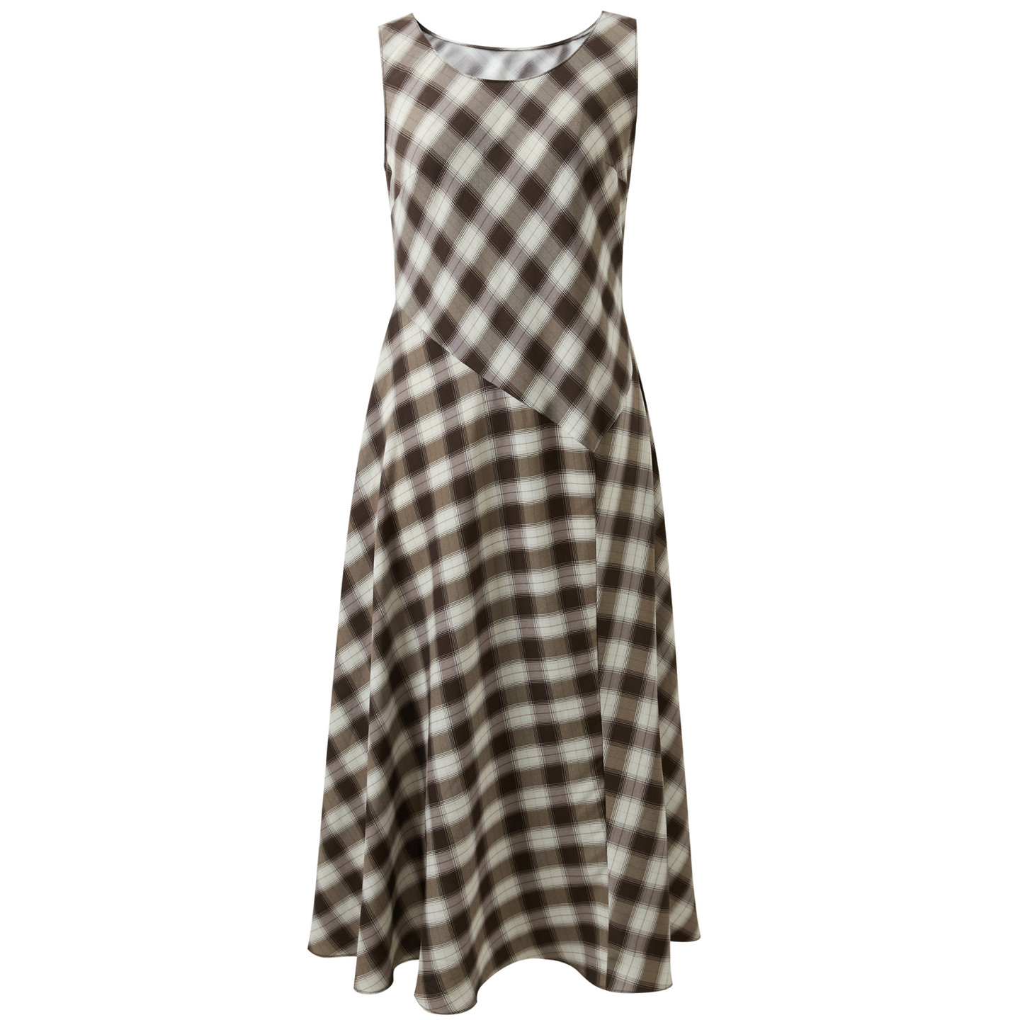 三彩2026春季新款格纹连衣裙解构无袖圆领A字裙收腰长裙M