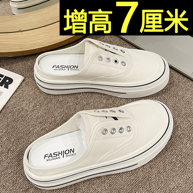 厚底包头半拖鞋女夏外穿休闲运动小白鞋内增高一脚蹬懒人帆布鞋