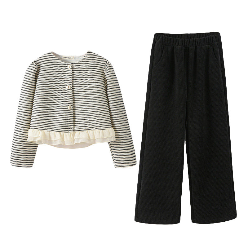 春秋款女童小香风外套条纹开衫阔腿裤中大童女孩休闲裤子两件套装