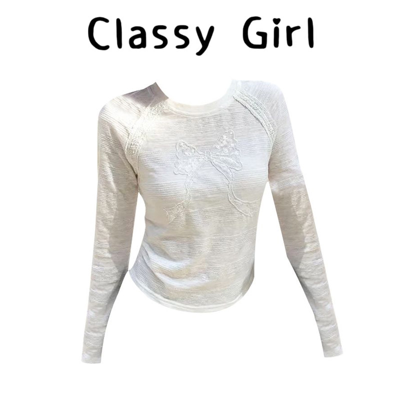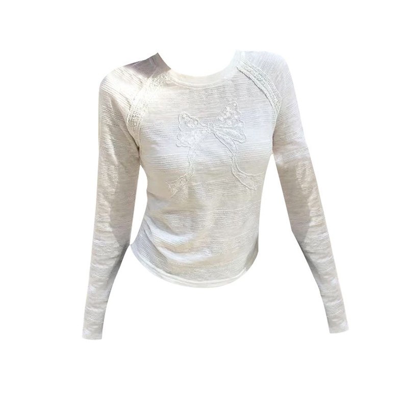 韩系白色长袖t恤女2026春季修身内搭蝴蝶结设计感短款上衣新款
