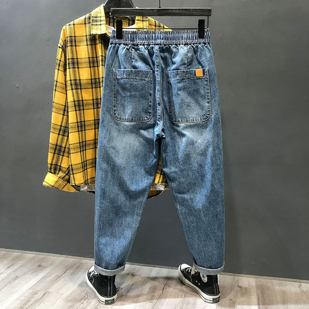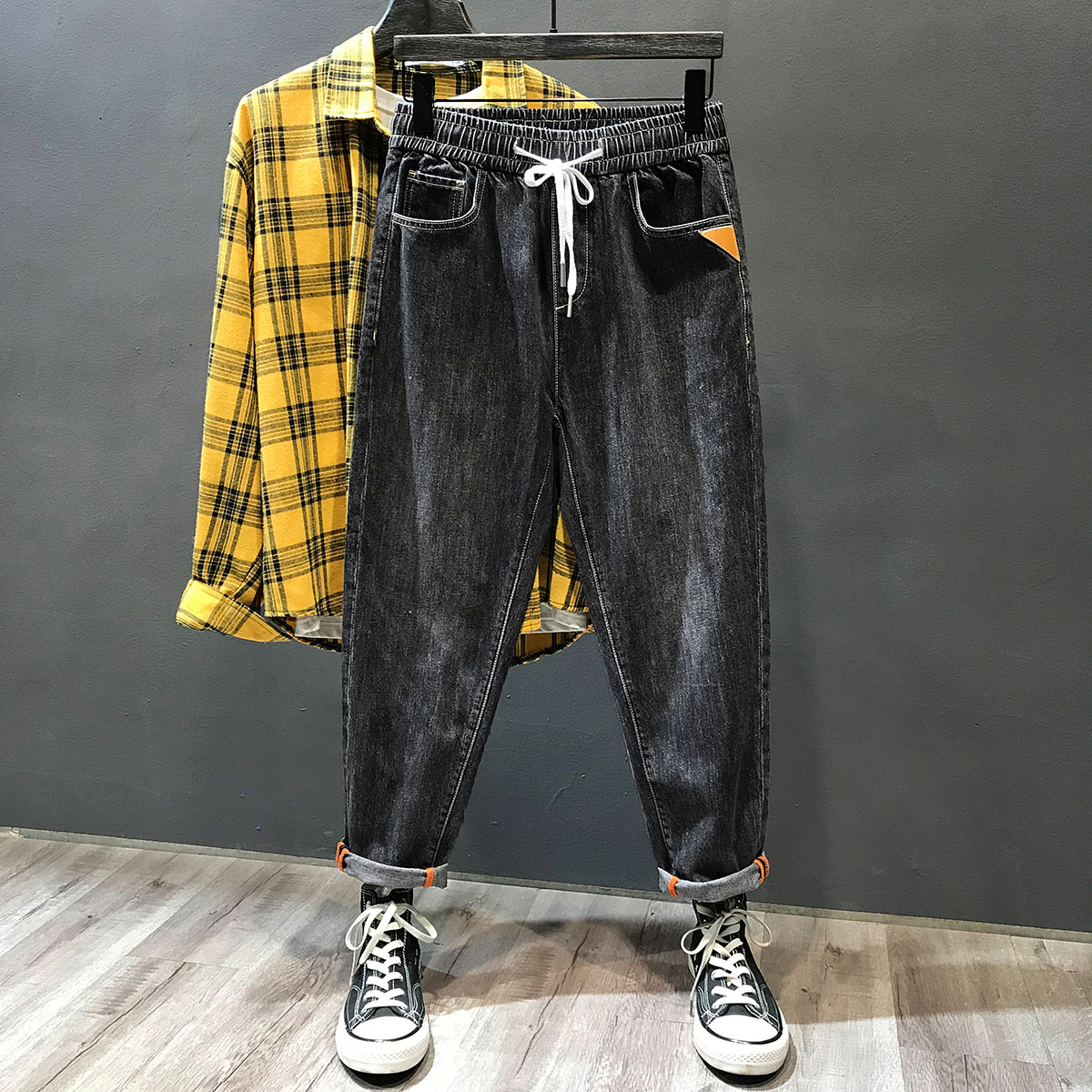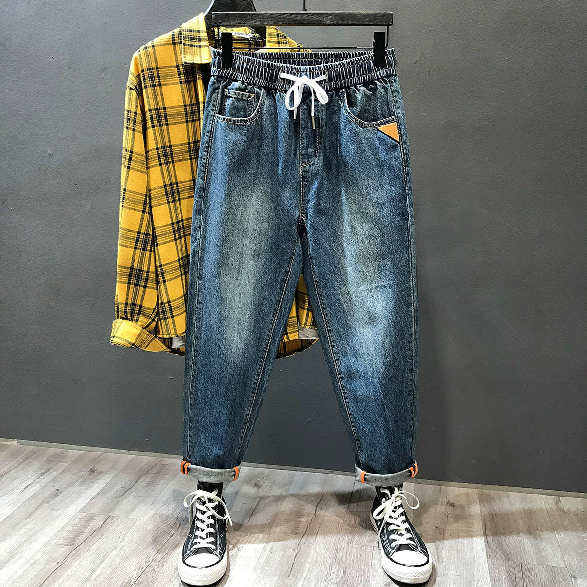 松紧腰牛仔裤男款大码宽松裤子男士春秋抽绳直筒男裤休闲九分裤潮