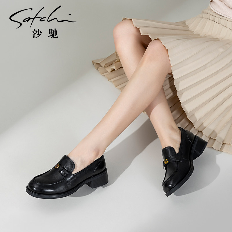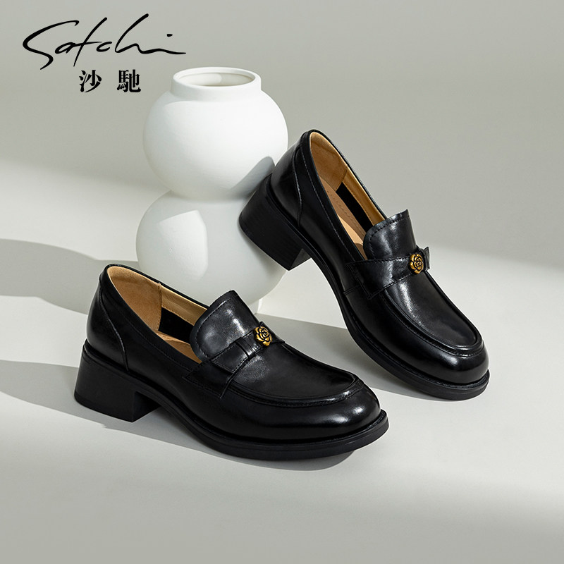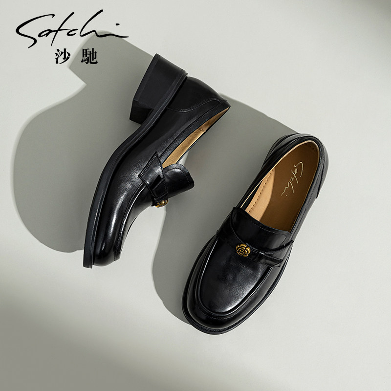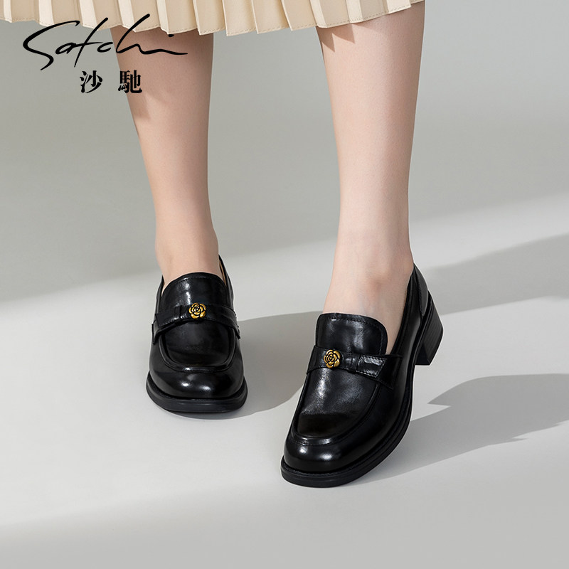 沙驰女鞋粗跟乐福鞋单鞋女2026新款黑色小皮鞋春夏季山茶花通勤鞋