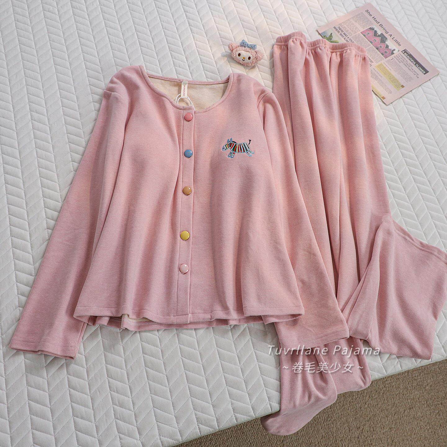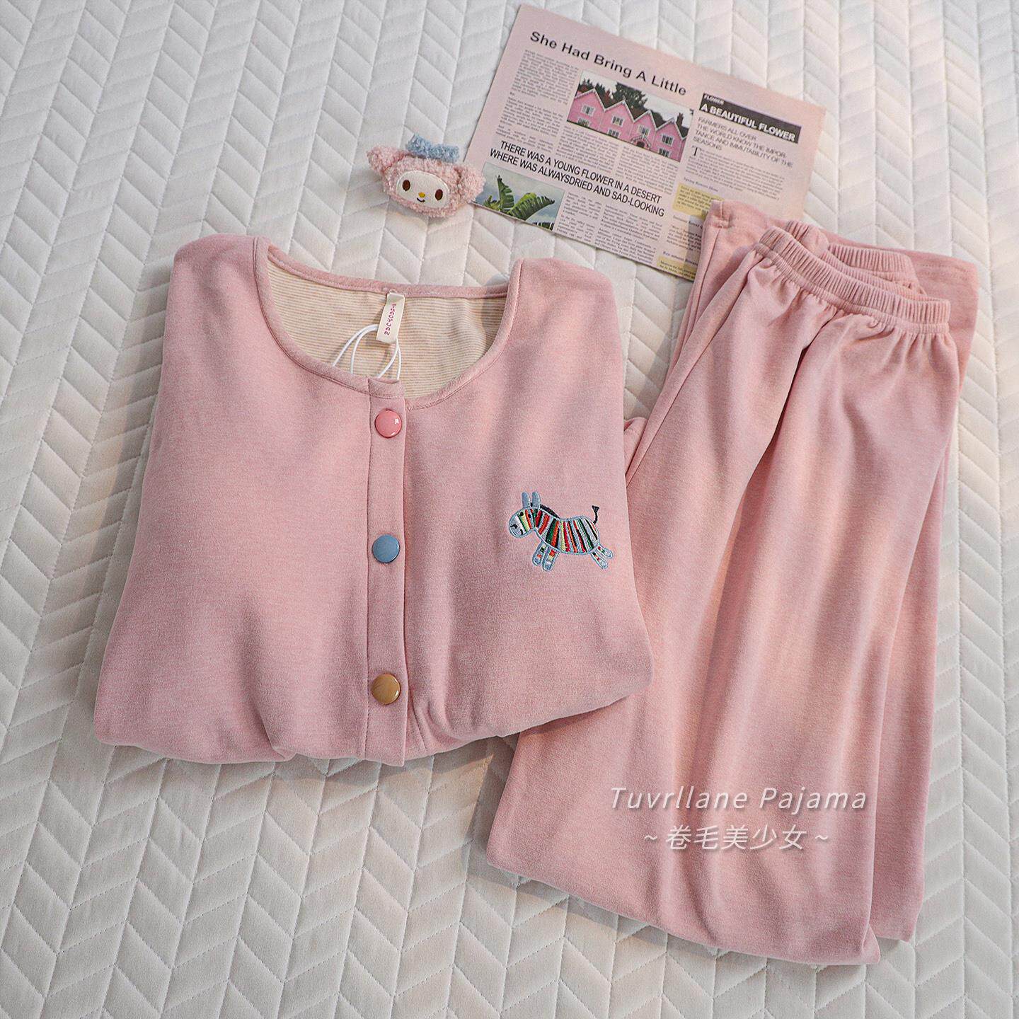 粉色带胸垫加厚保暖德绒长袖睡衣女秋冬季新款羊绒卡通纯棉家居服