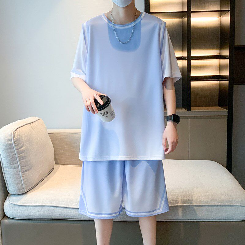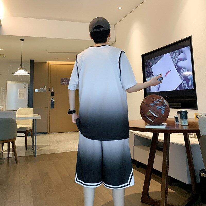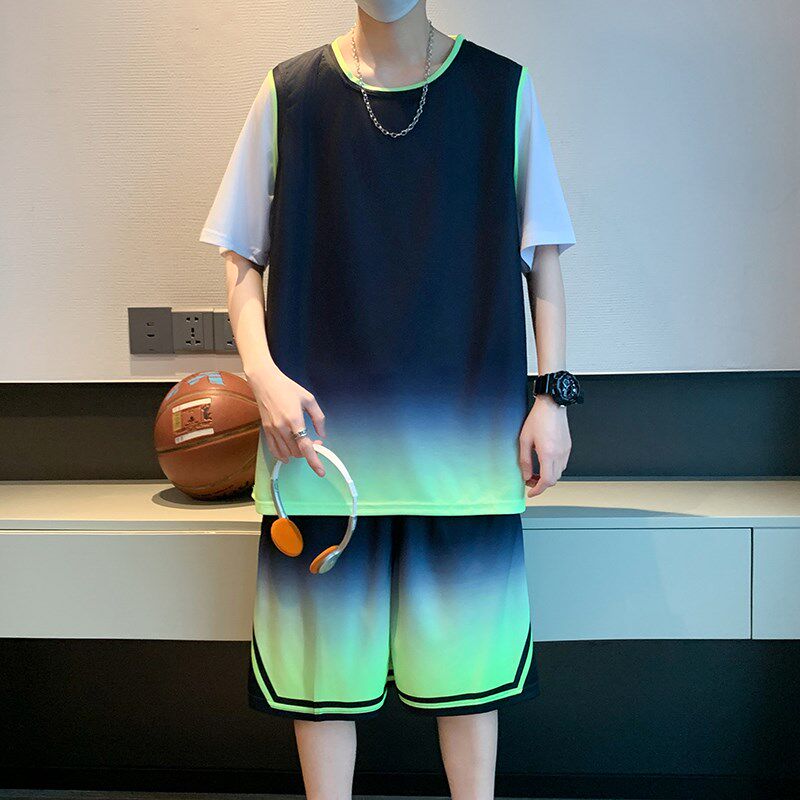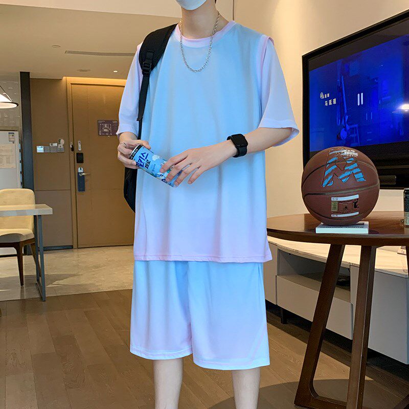 冰丝短袖t恤男高中初中生渐变篮球服套装青少年假两件速干运动衣