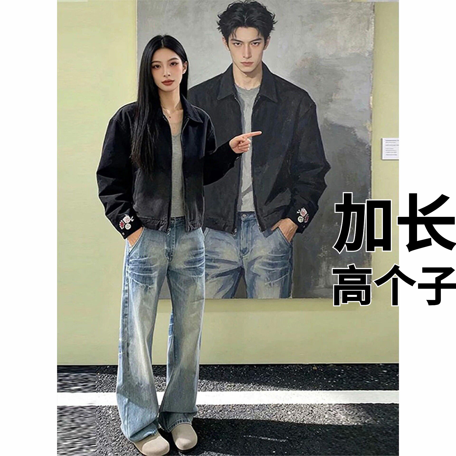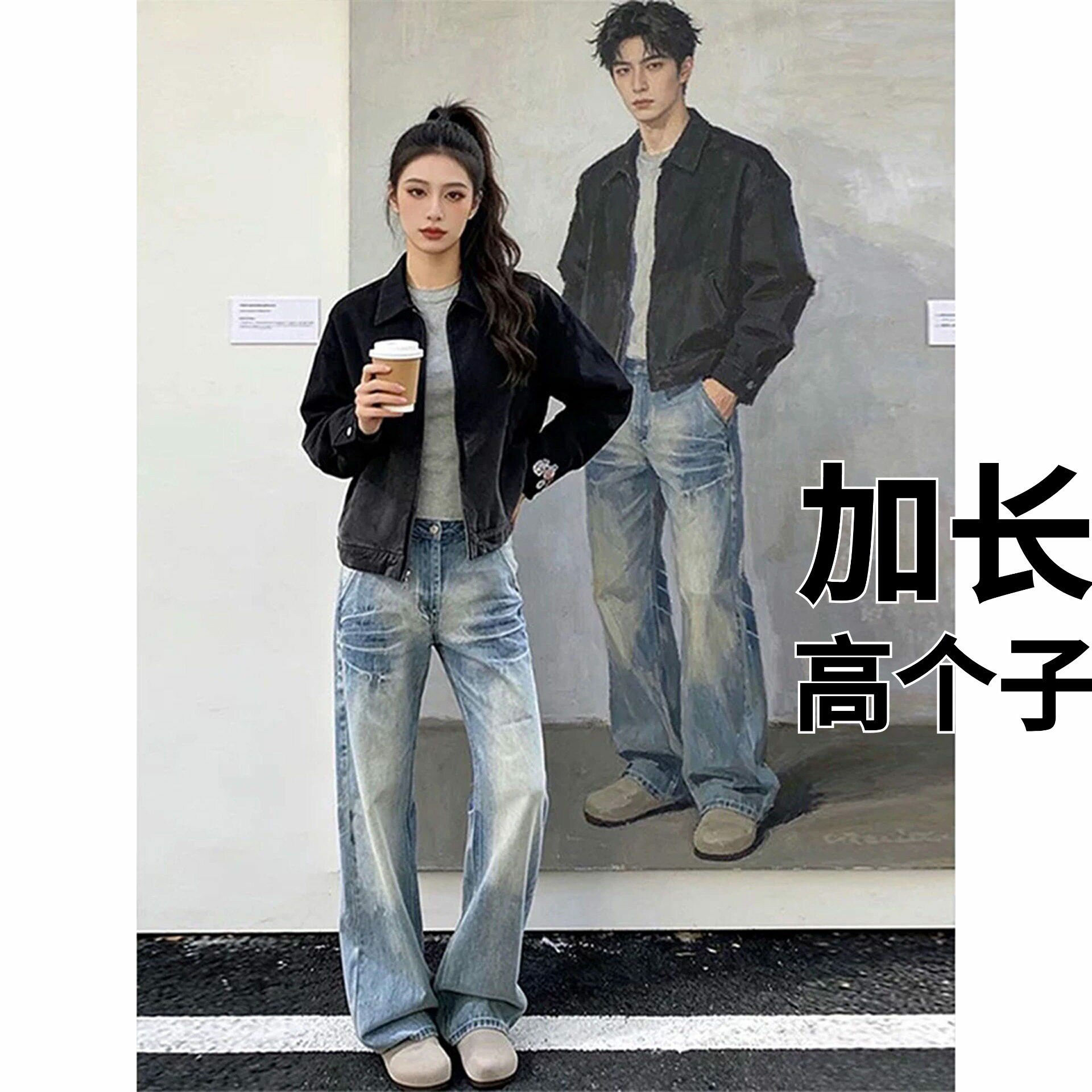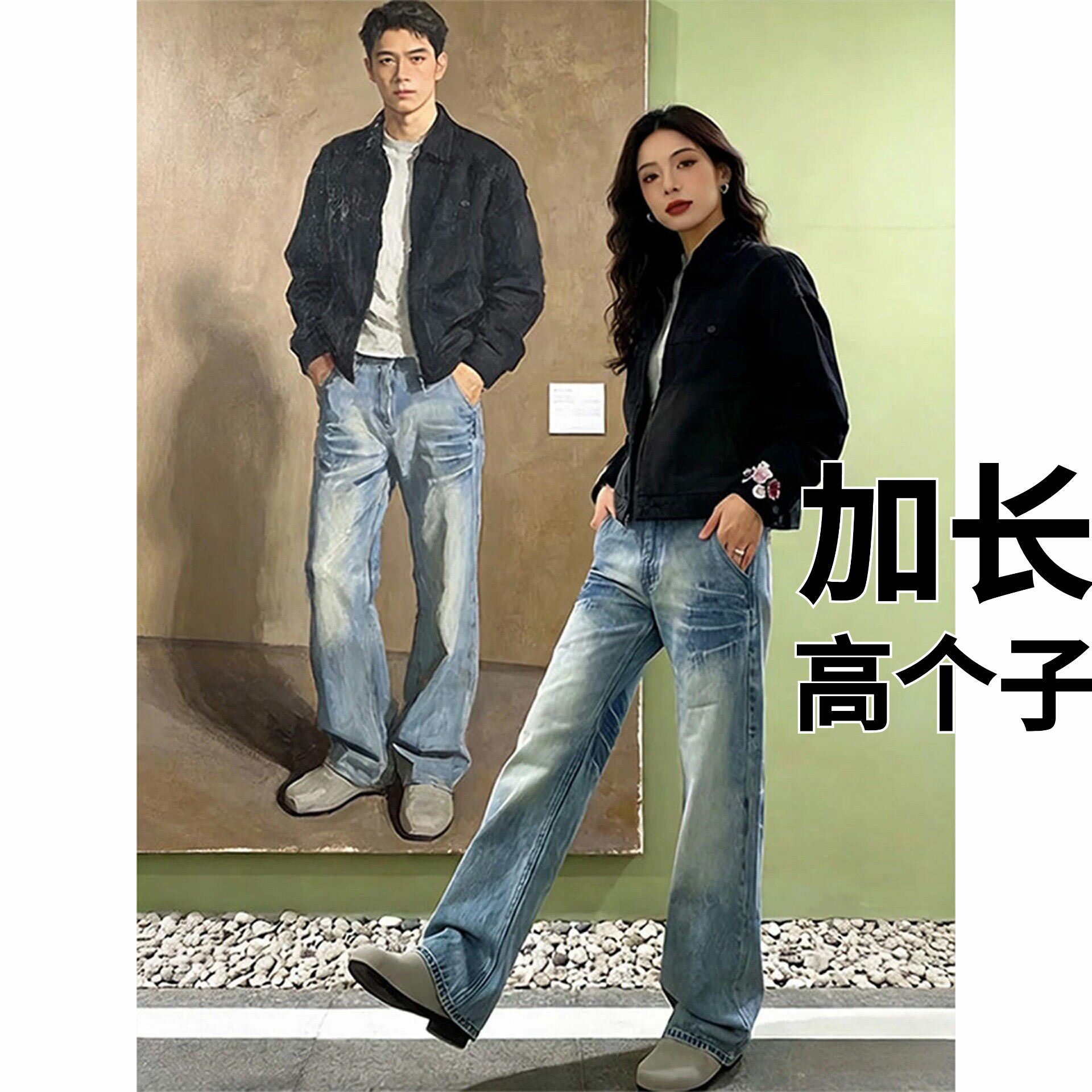 高个子加长版裤子男款春季青少年弯刀牛仔裤美式显腿长直筒微喇裤