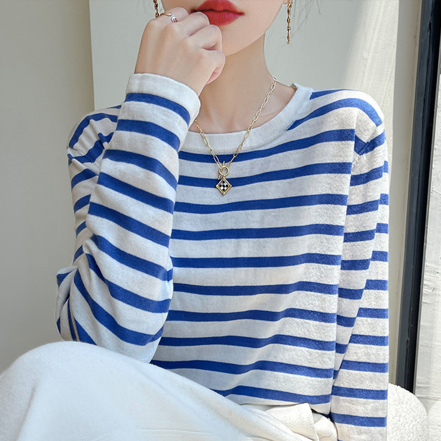 时尚条纹针织衫女2026新款早春长袖单穿薄款宽松上衣可外穿打底衫