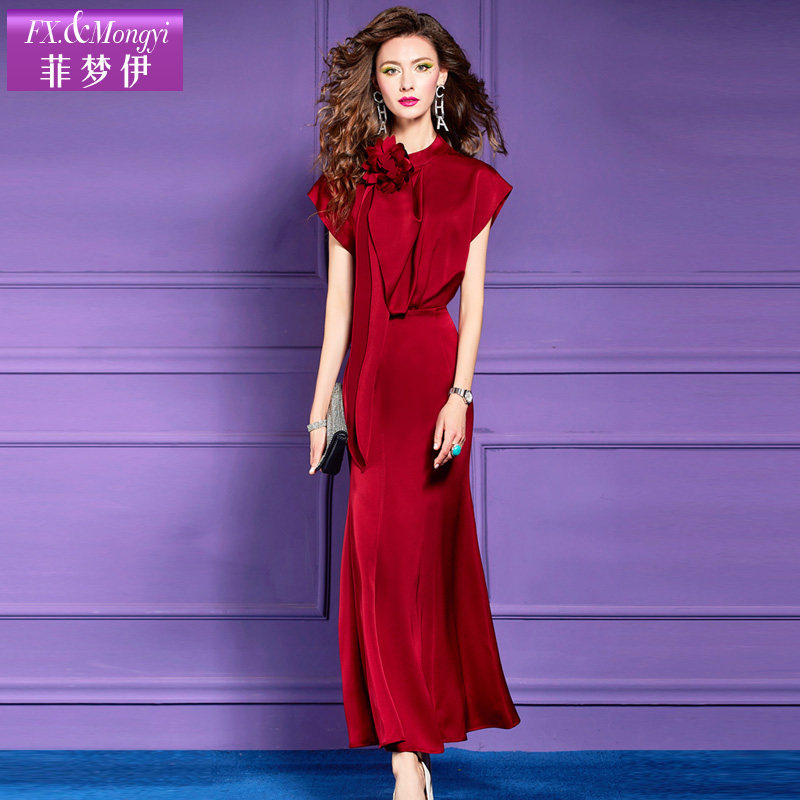 菲梦伊立体花朵红色连衣裙女夏装法式轻奢高级感收腰气质长裙礼服