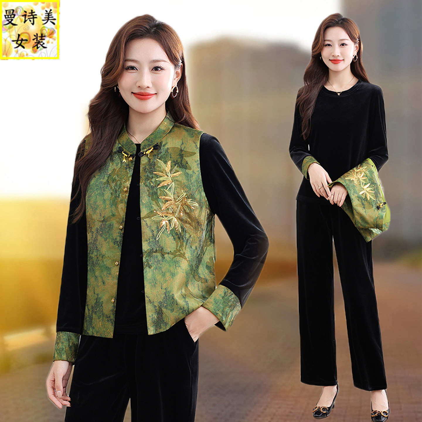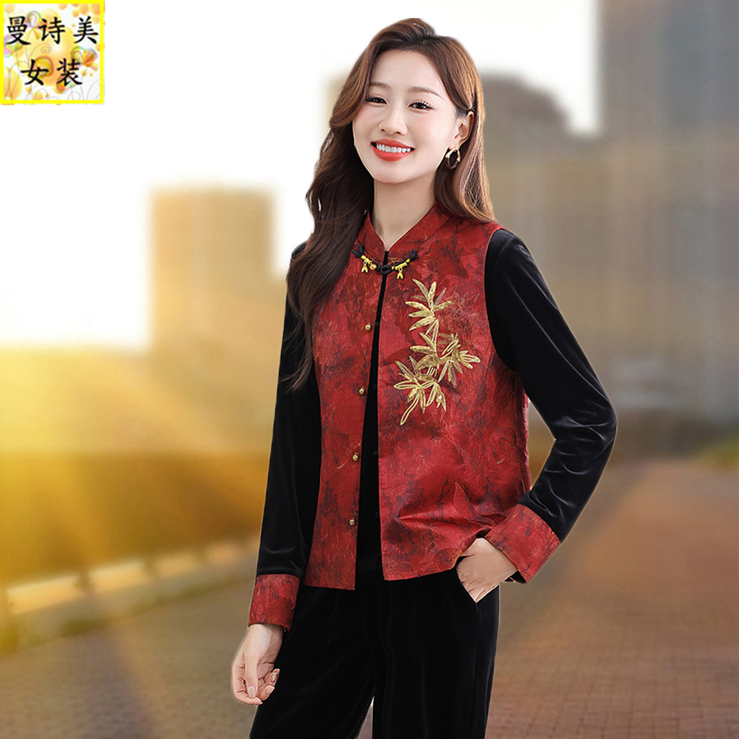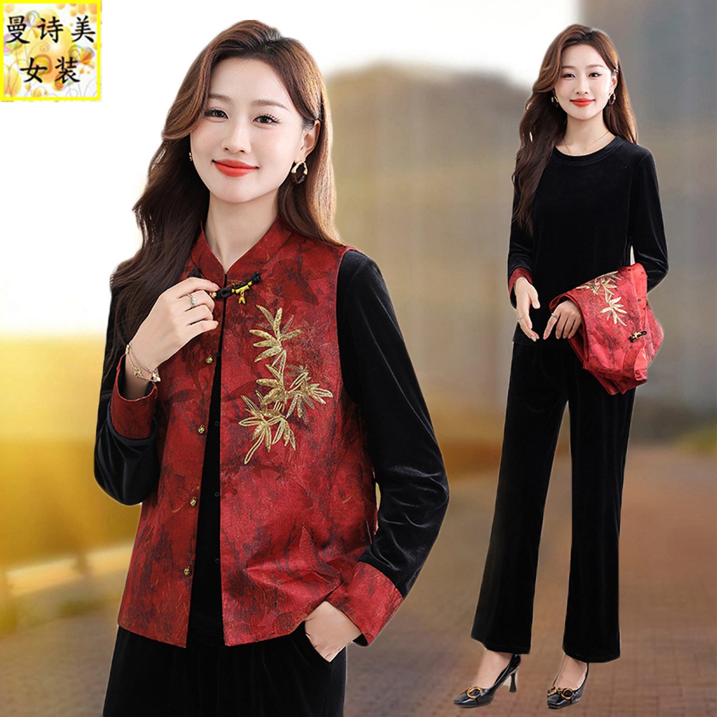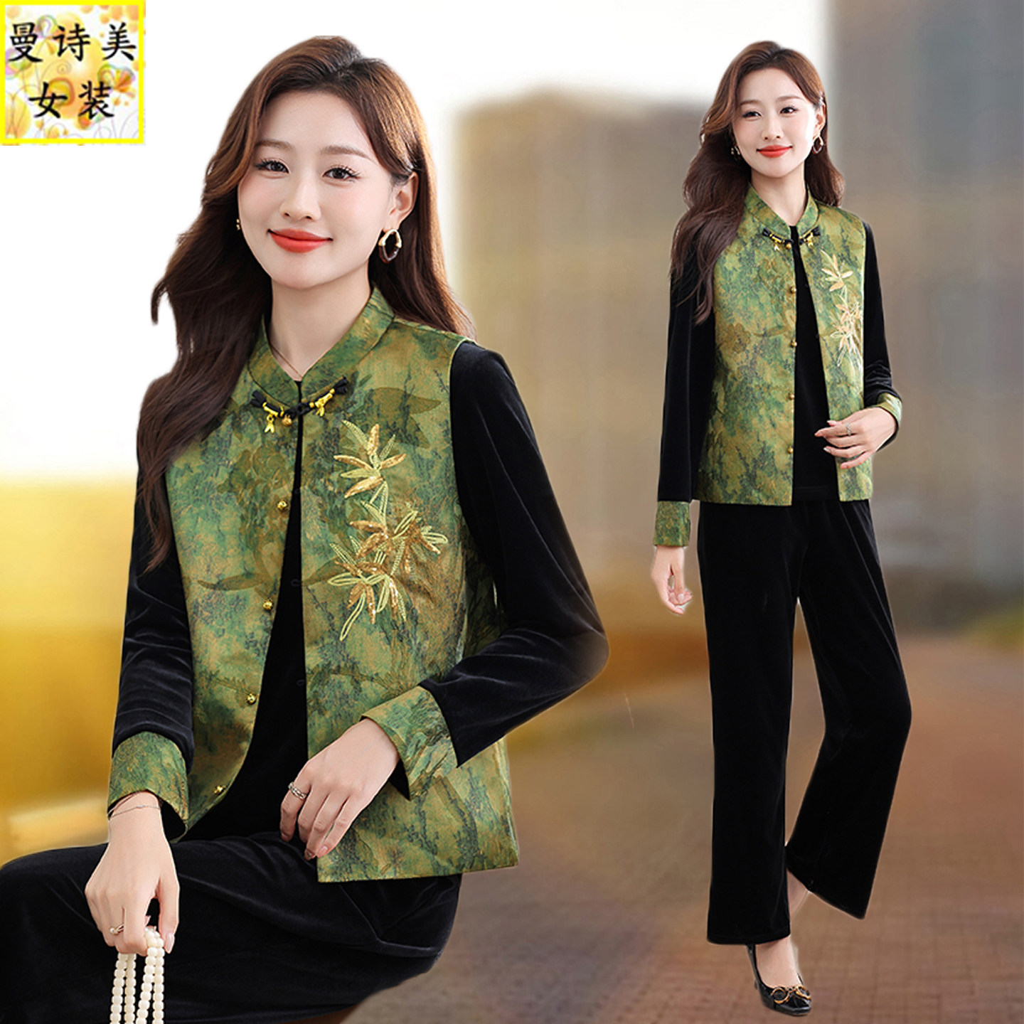 新中式国风唐装马甲女2026新款春秋季时尚洋气爆款坎肩妈妈三件套