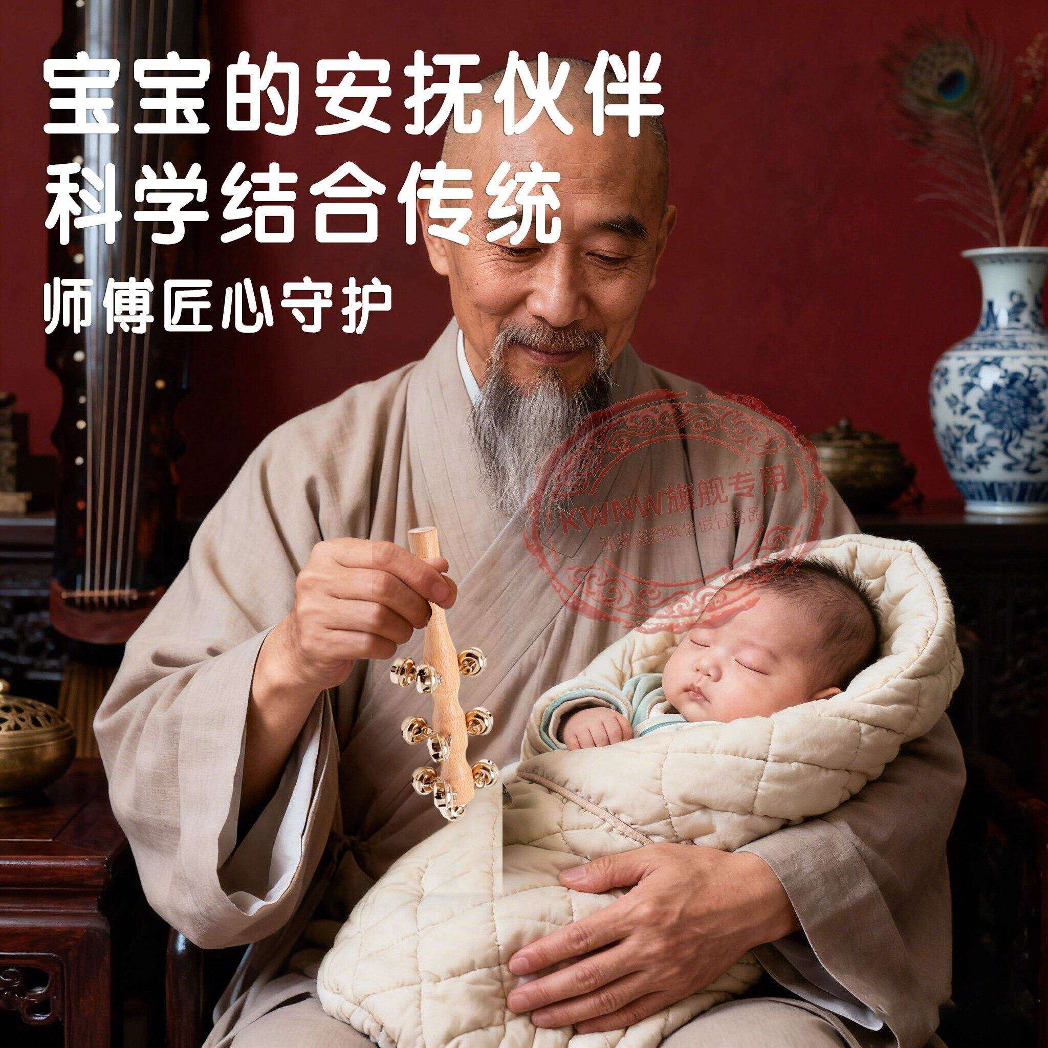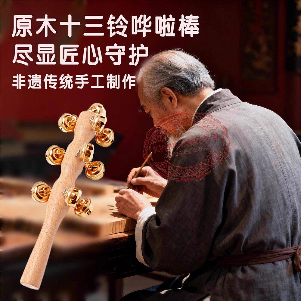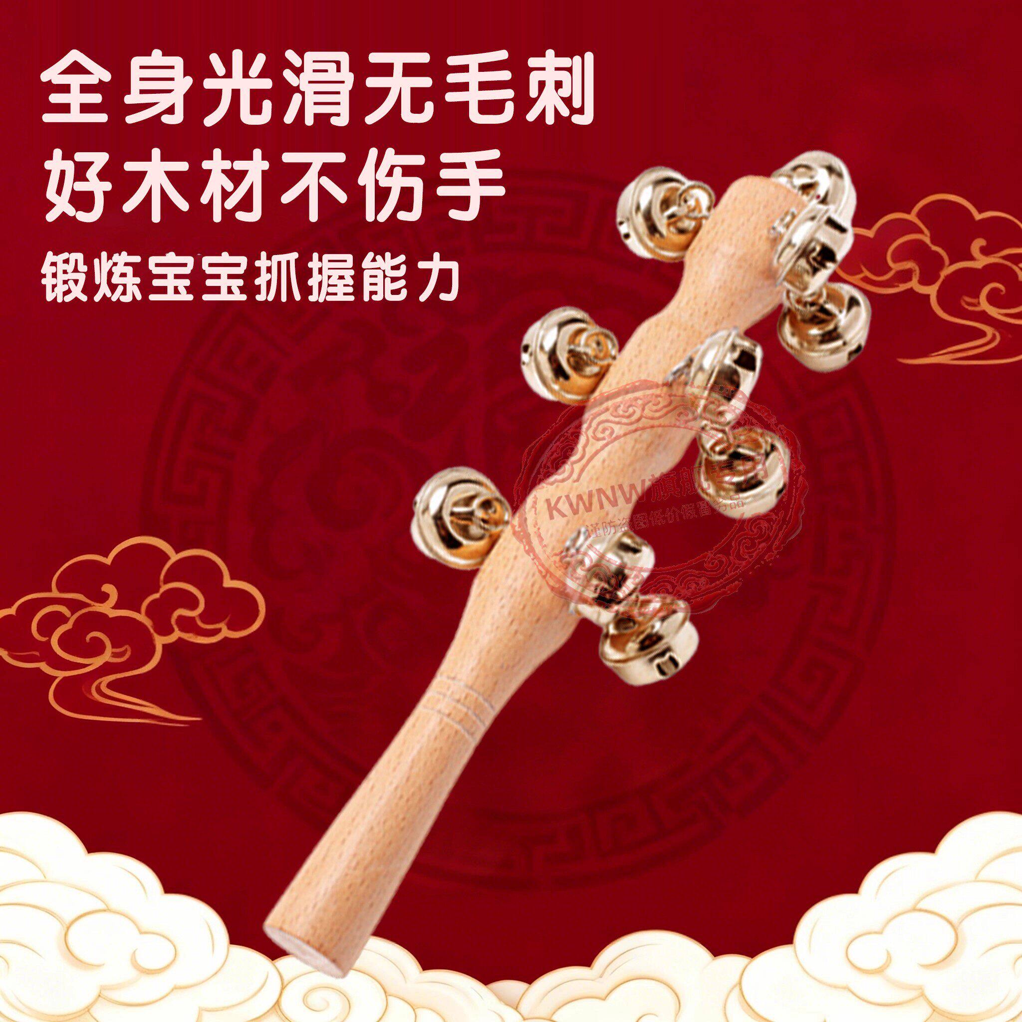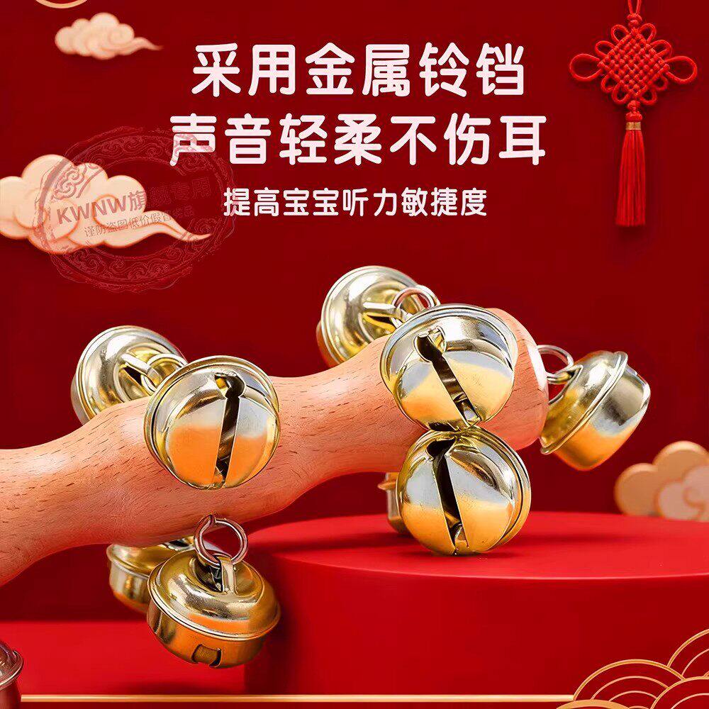 老式手工木质黄铜棒铃铛哗啦棒婴儿羊皮拨浪鼓传统宝宝新生儿牛皮