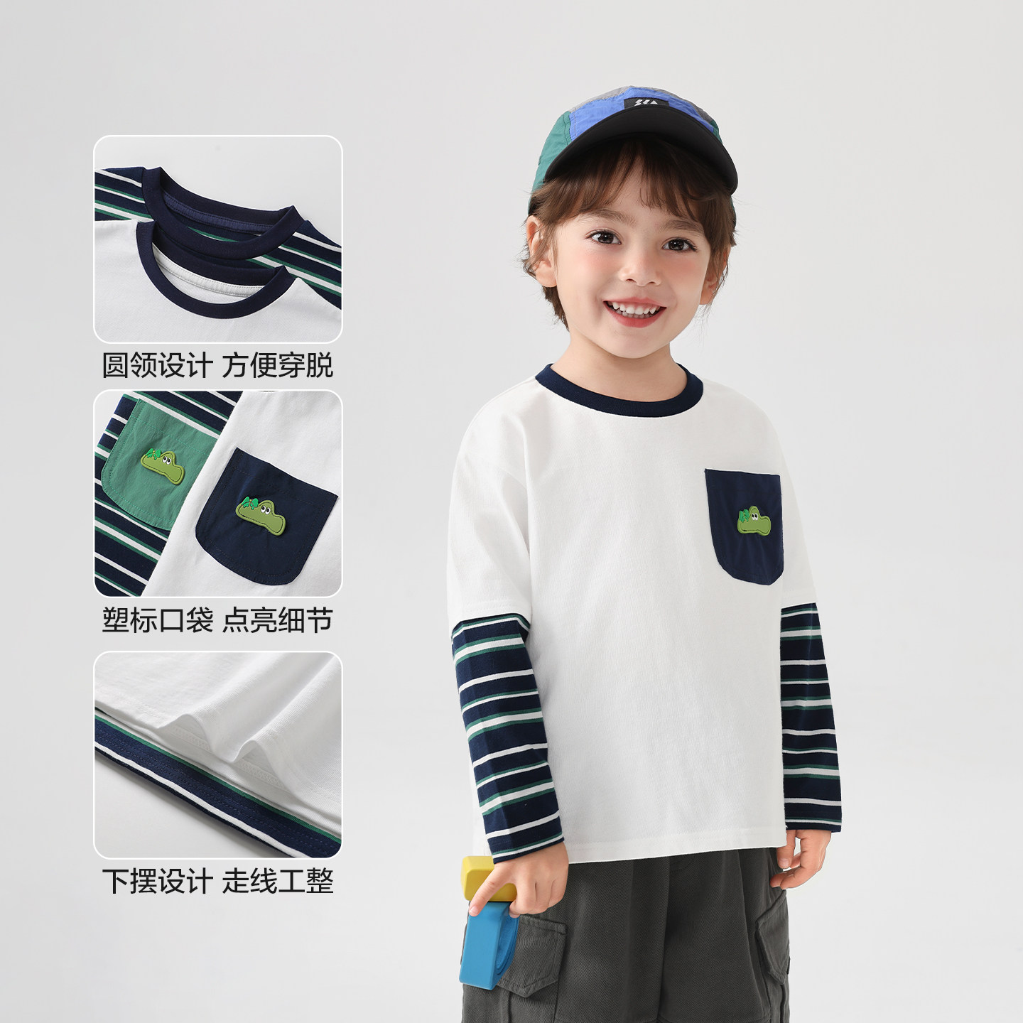 右欧儿童假两件条纹长袖T恤男女童打底衫春秋季新款童装上衣内搭