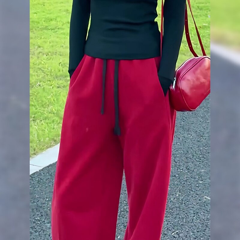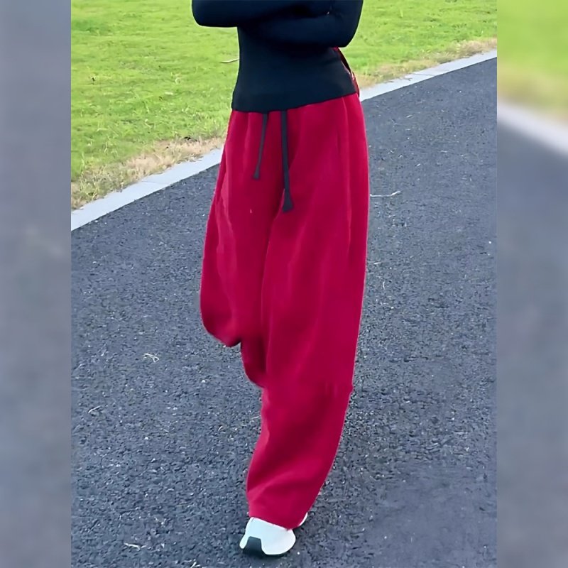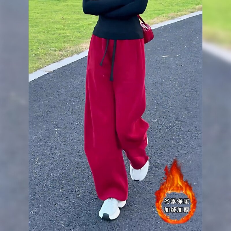 红色加绒裤子女秋冬2026新款今年流行爆款加厚弯刀裤阔腿运动卫裤