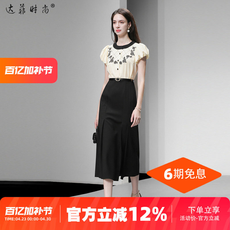 2026夏季新款气质圆领撞色玫瑰绣花灯笼袖收腰荷叶边长裙连衣裙女