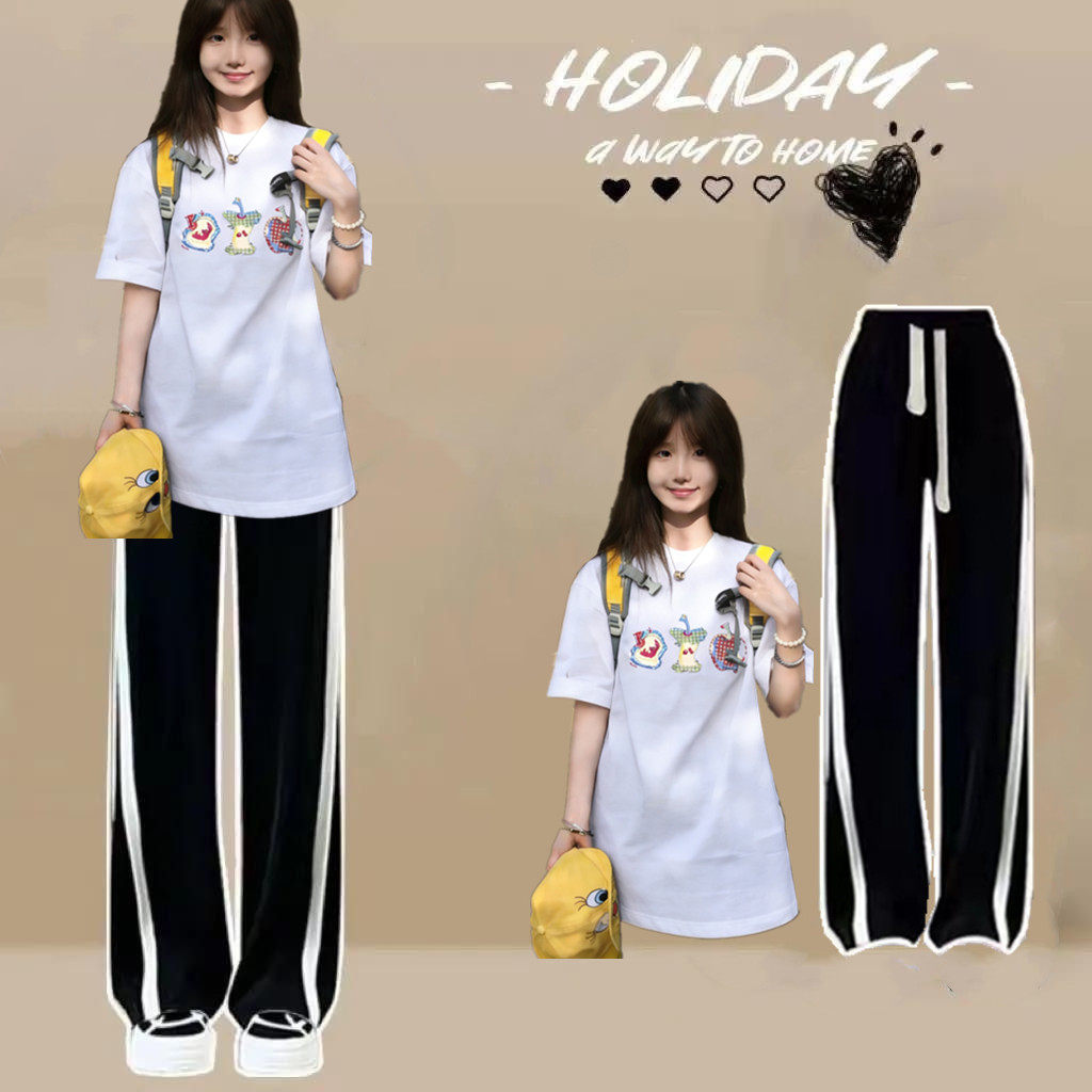 初中生纯棉短袖一整套女学生休闲运动套装高中生白边阔腿裤两件套