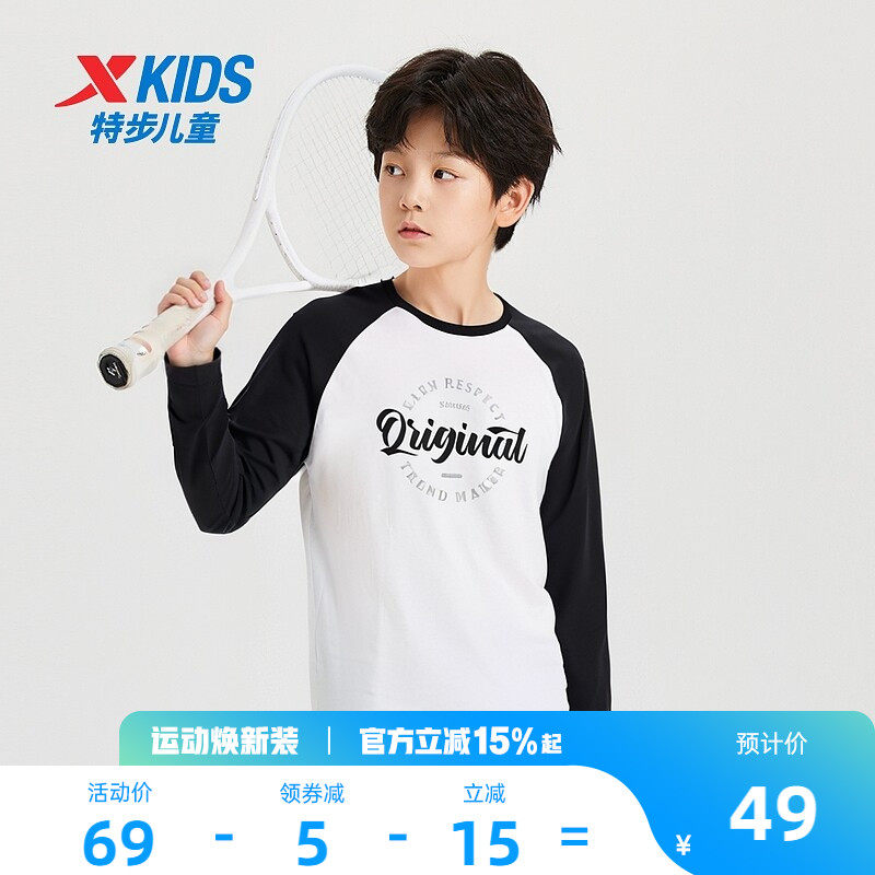 特步童装春季男童拼接纯棉T恤儿童打底针织衫中大童圆领上衣春装