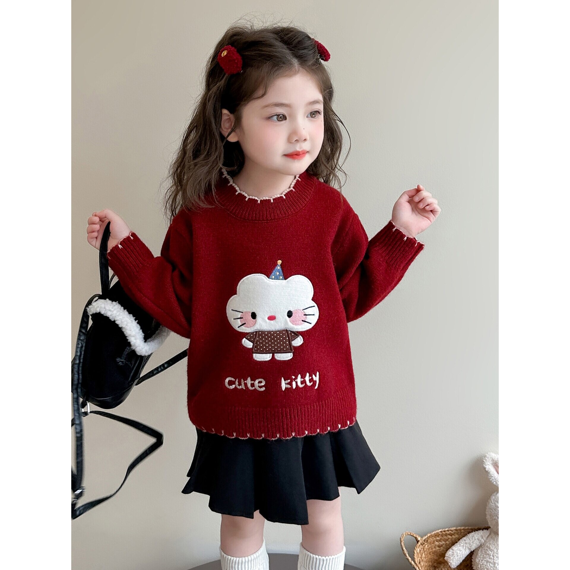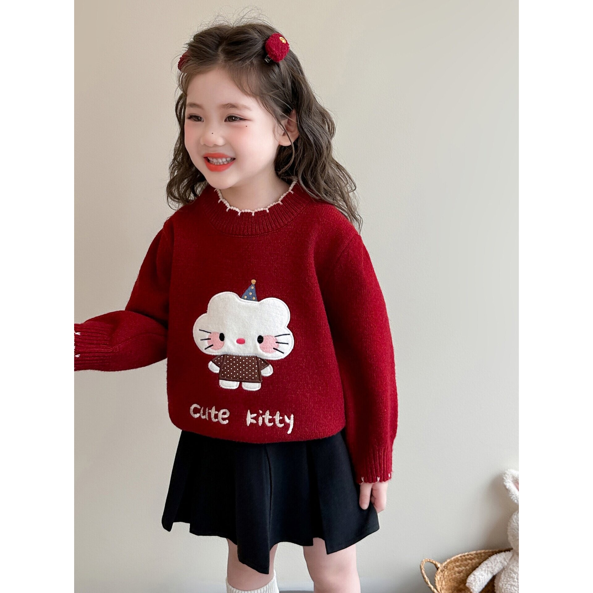 全棉女童毛衣春季2026新款洋气时髦儿童冬装内搭女宝宝红色薄款