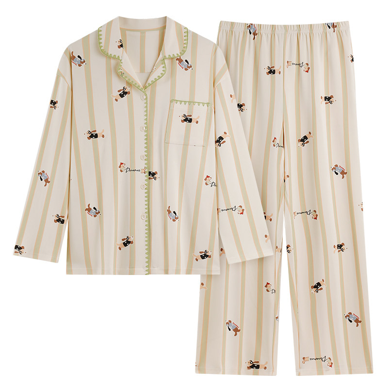 2026新款睡衣女款100%纯棉长袖开衫翻领春秋季条纹卡通家居服套装