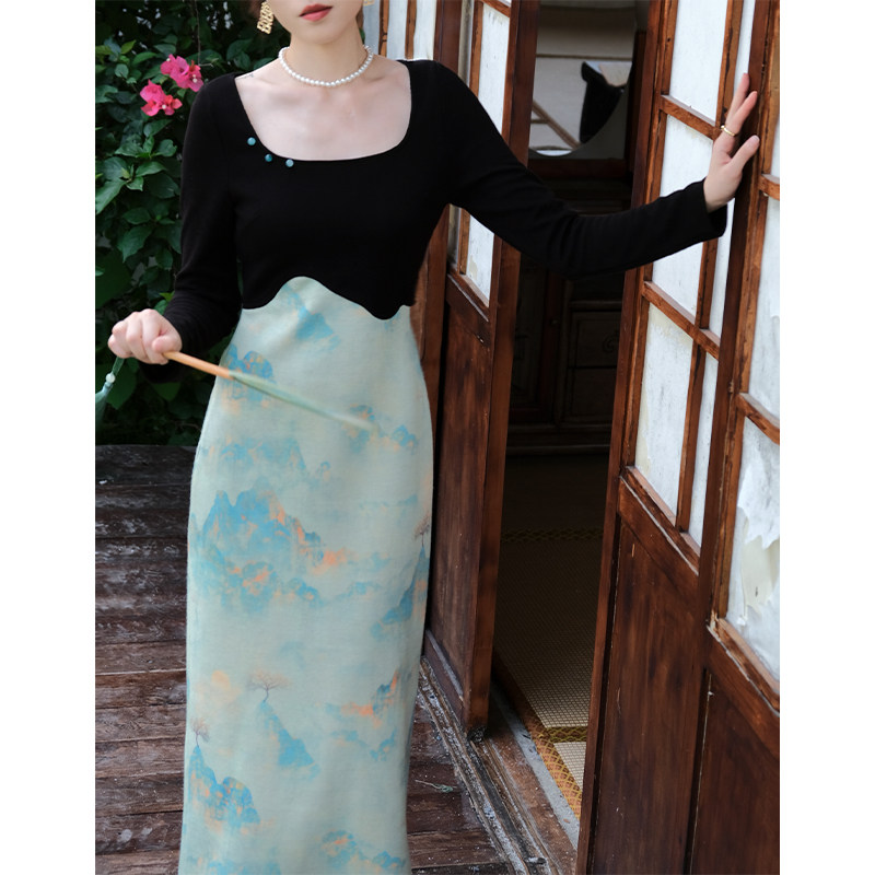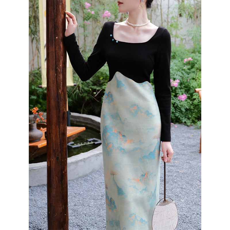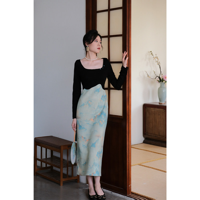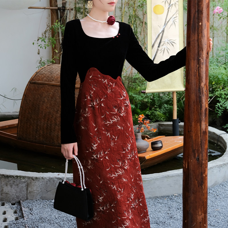鹿与玫瑰新中式红色连衣裙女国风改良旗袍裙气质拼接长袖礼服裙子