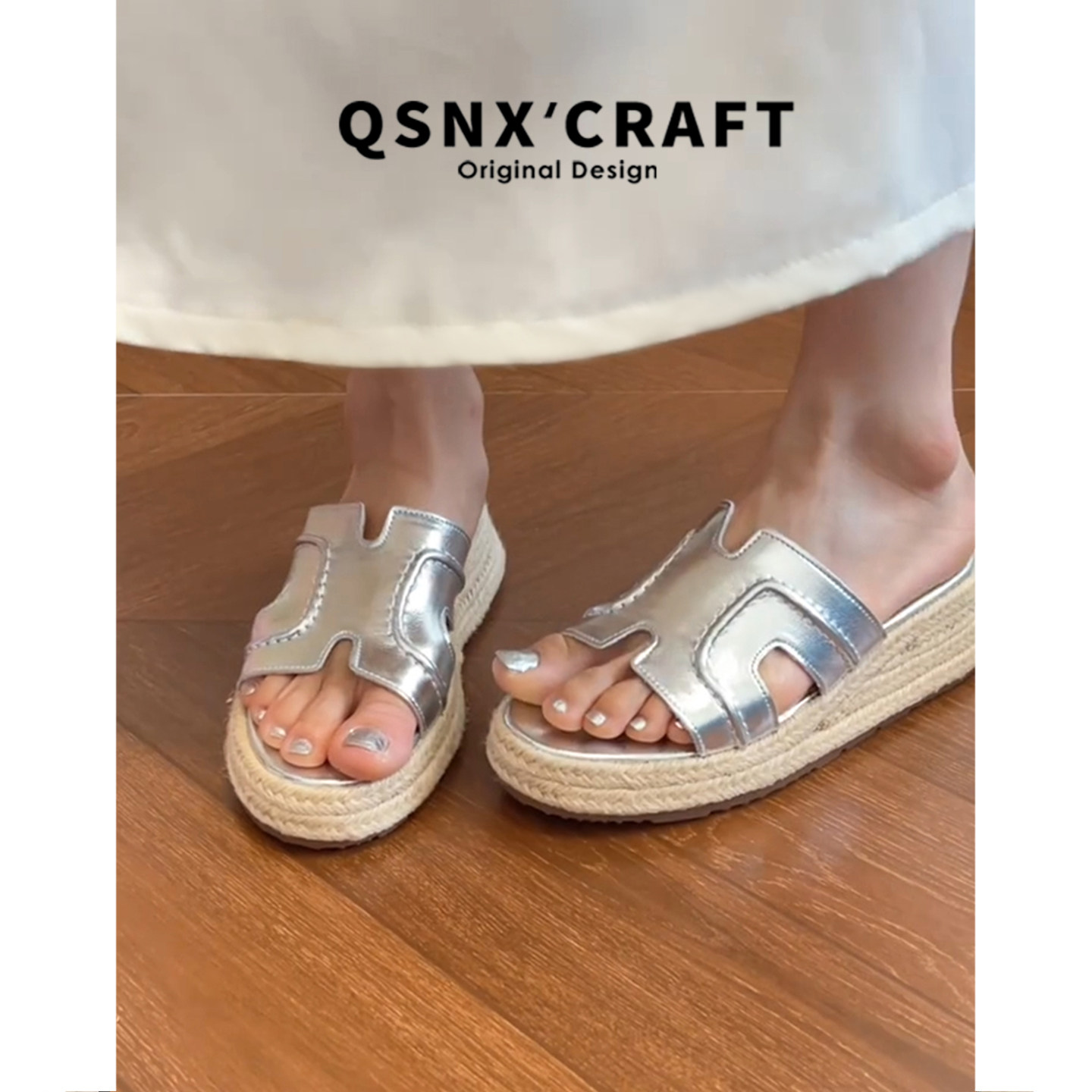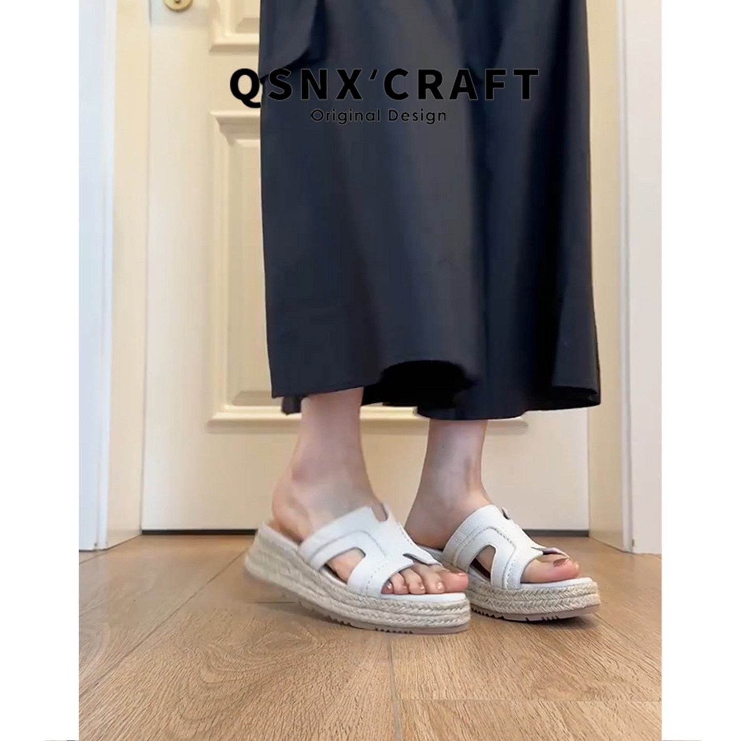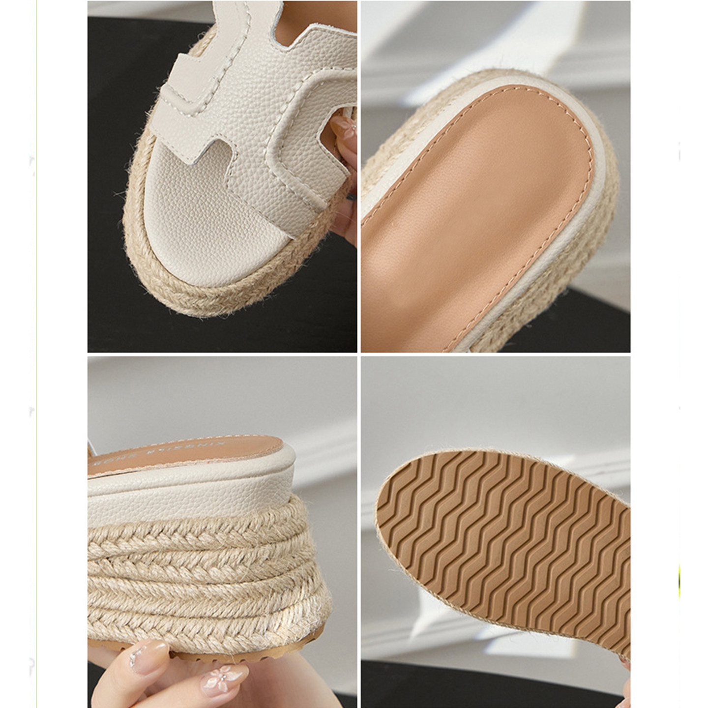 牛皮版~草编一字拖鞋女2026新款夏外穿厚底松糕鞋休闲露趾凉拖鞋
