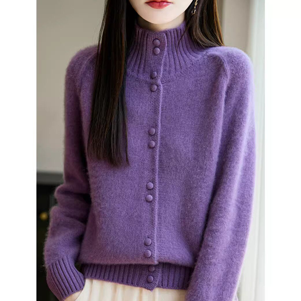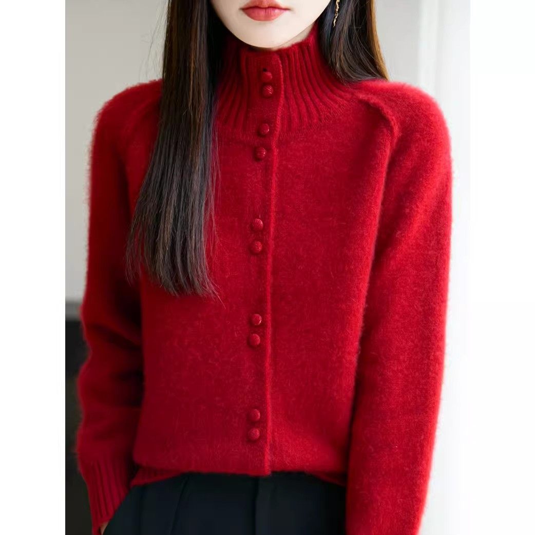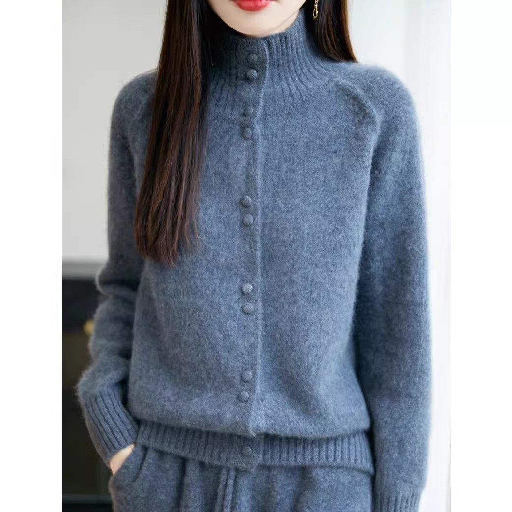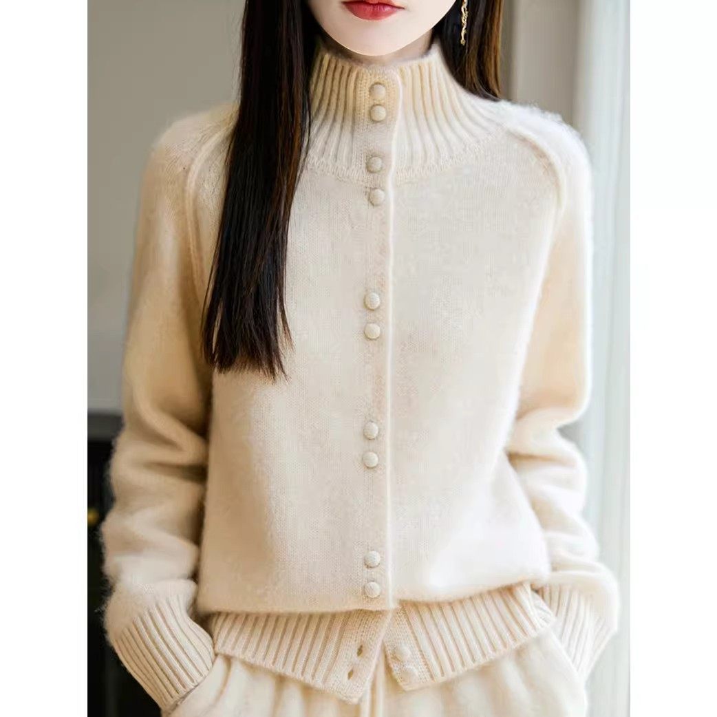 简约风立领纽扣针织开衫女秋冬新款加厚宽松显瘦慵懒保暖毛衣外套
