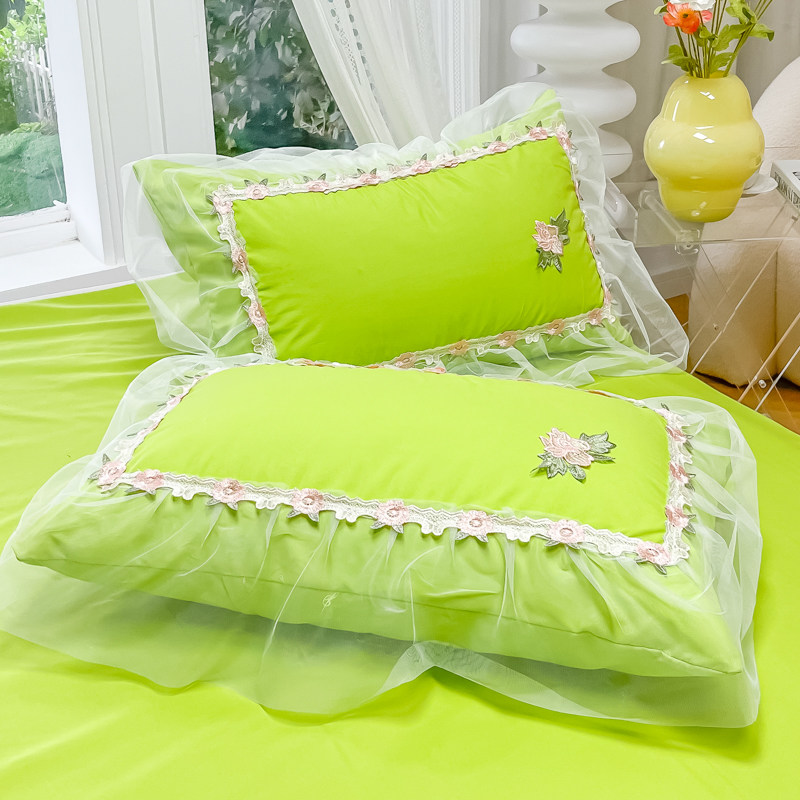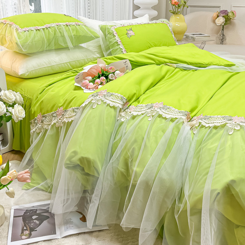 绿色小清新花朵白纱床裙款四件套春夏床罩被套花边公主风床上用品