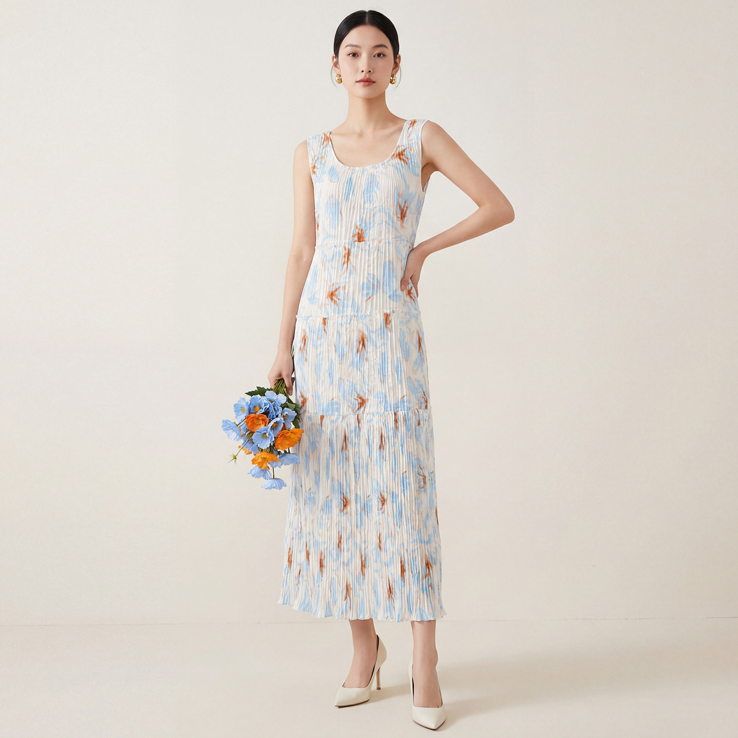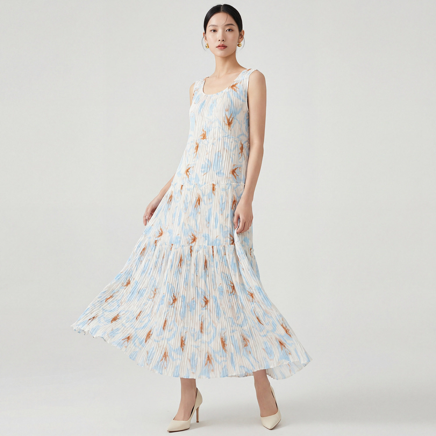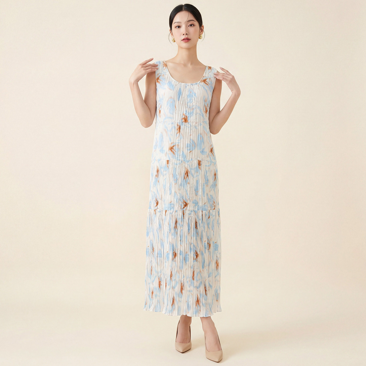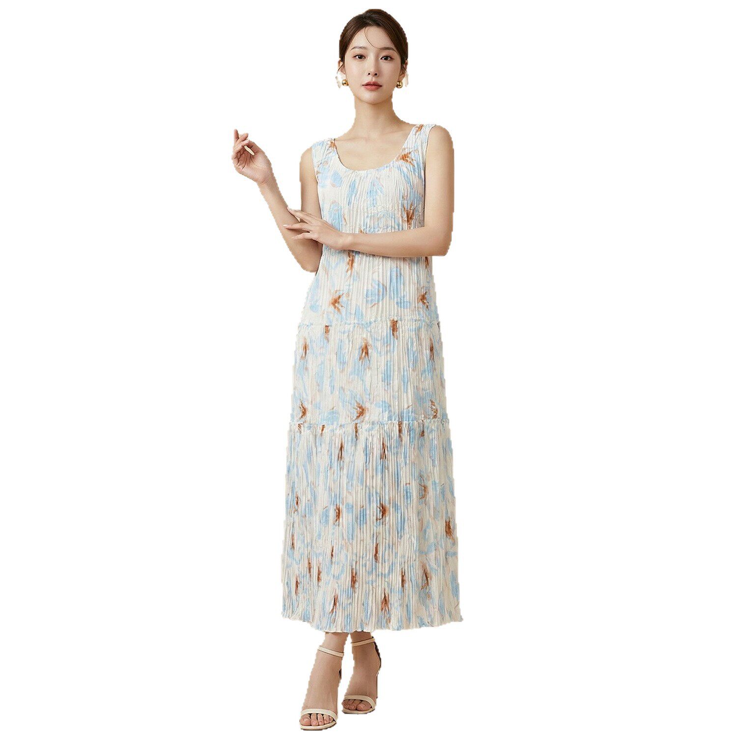 三宅连衣裙女春夏高级感日常穿搭吊带裙印花宽松洋气百搭褶皱长裙