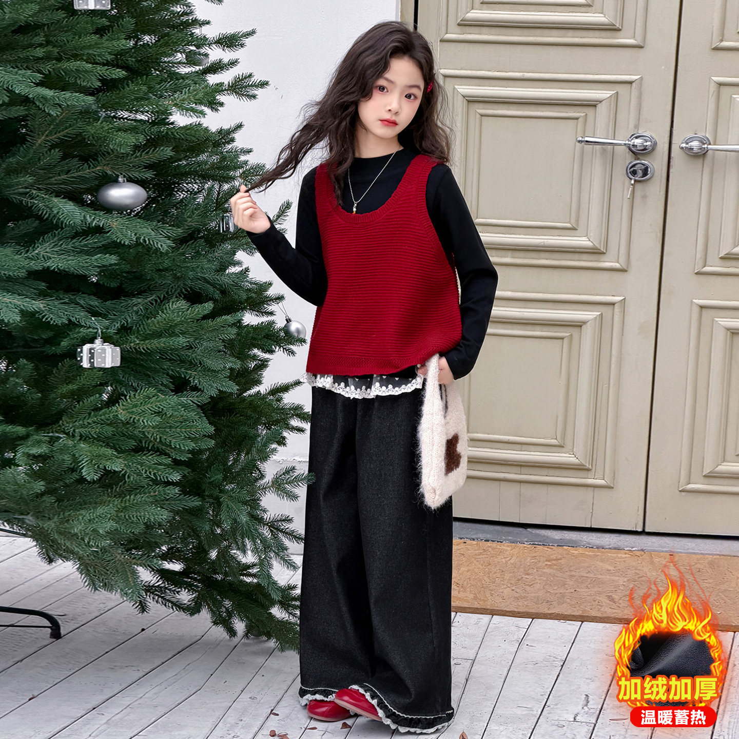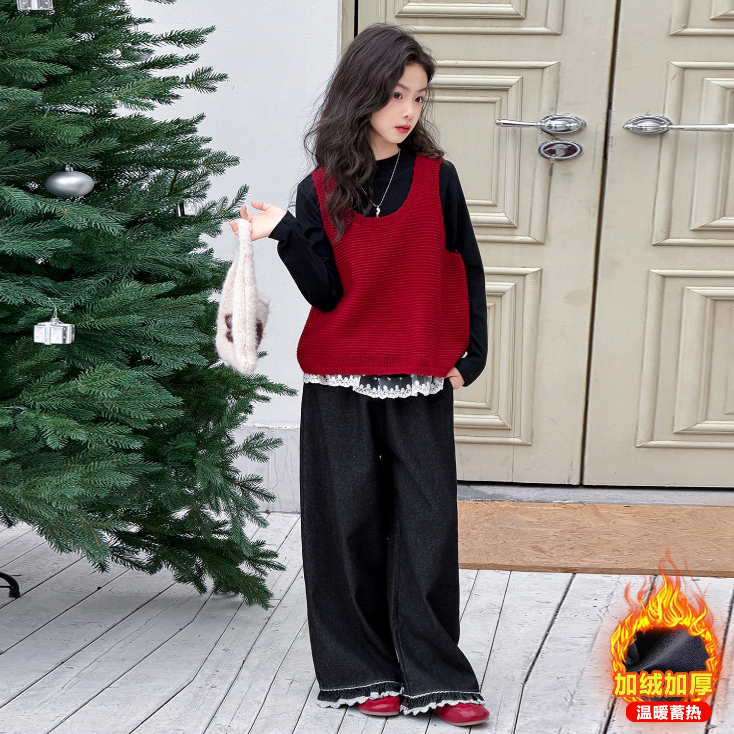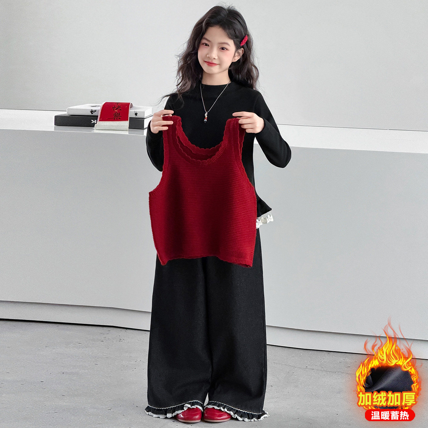 女童冬季毛衣马甲套装2025新款儿童打底衫背心直筒裤子三件套洋气
