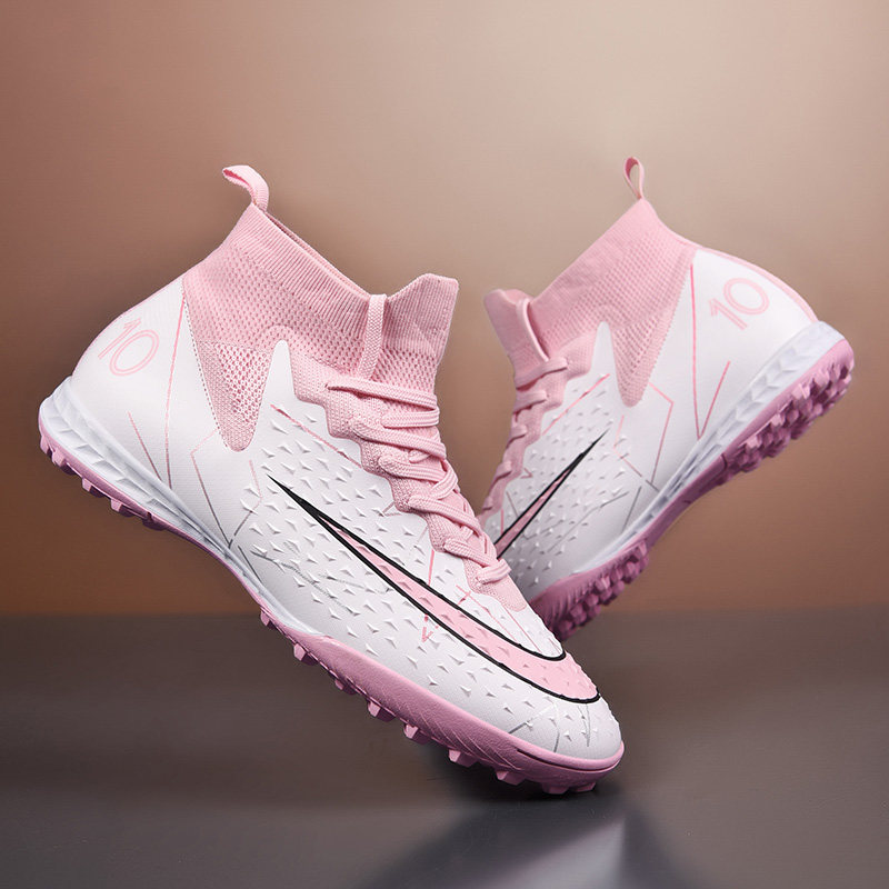 C罗新品足球鞋男AG长钉儿童小学生碎钉草地比赛训练鞋高帮粉色女