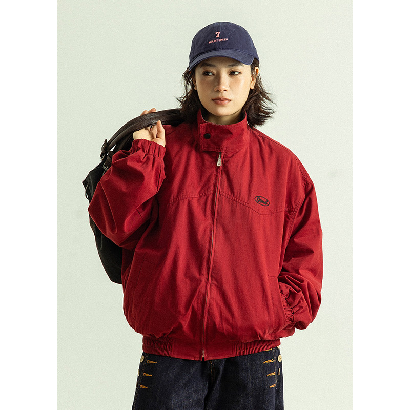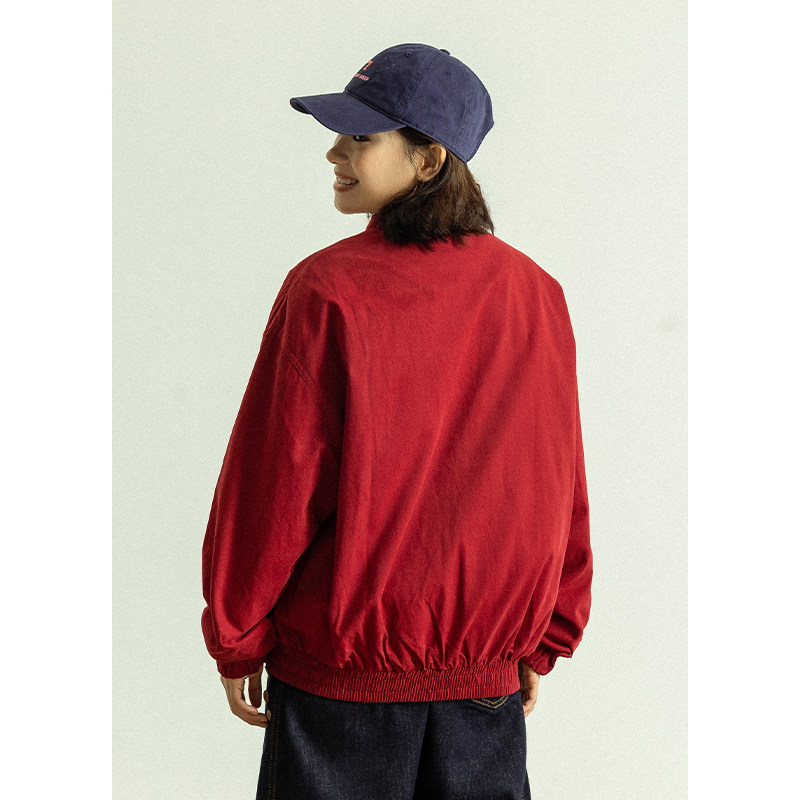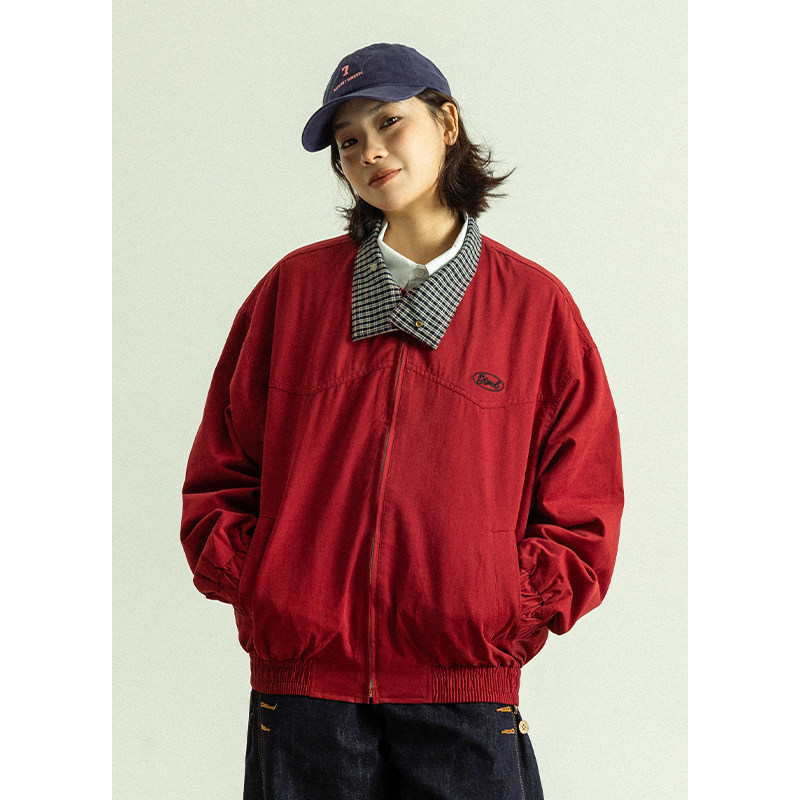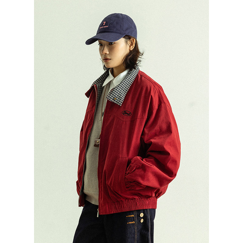 GoodNorth美式复古格子翻领红色外套男女款春季宽松立领休闲夹克