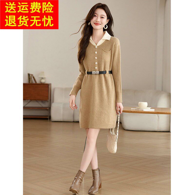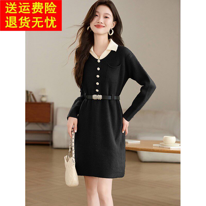 设计感假两件翻领针织连衣裙2026新款女秋冬小个子显瘦打底毛衣裙
