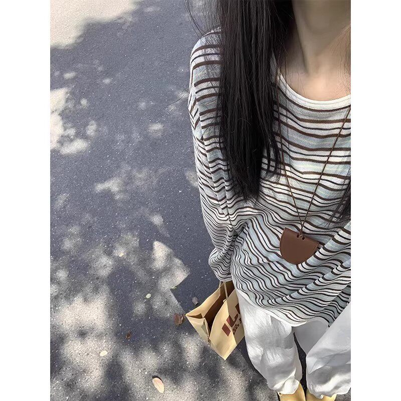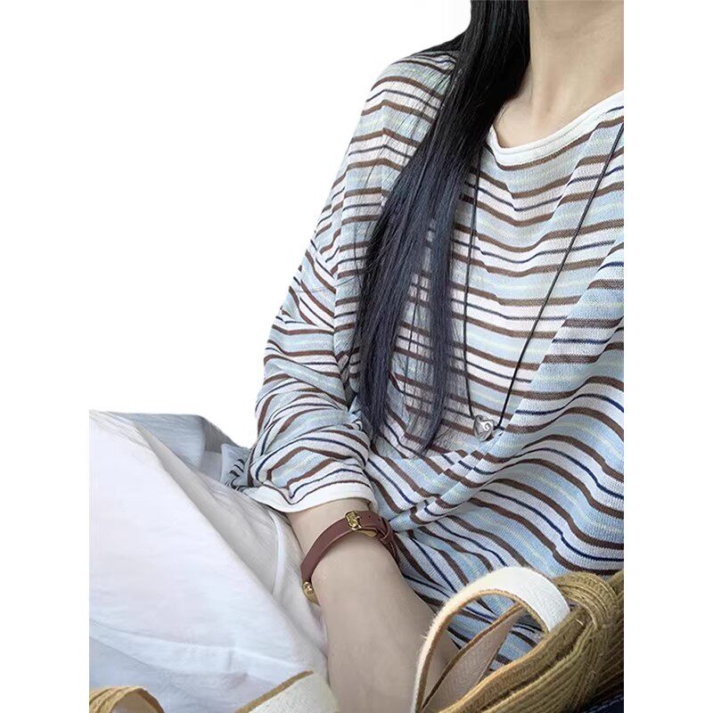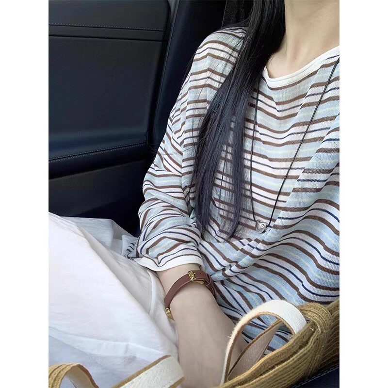 慵懒风冰丝防晒罩衫女早春2026新款宽松条纹薄款长袖t恤针织上衣